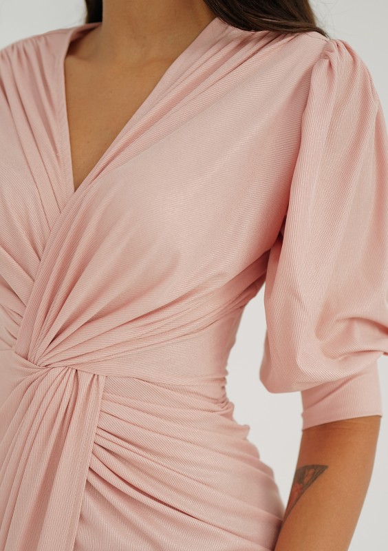 Pudrowa sukienka z wysmuklającą draperią, poduszkami i bufkami. Efektownie wykonana z tkaniny z błyszczącą nicią.