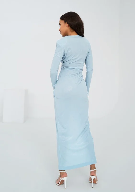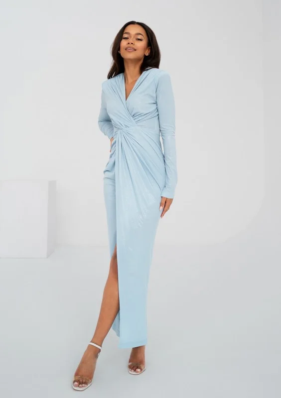 Błękitna sukienka maxi z długim rękawem i wysmuklającą draperią. Wyjątkowa kreacja wieczorowa, wykonana z efektownie błyszczącej tkaniny.