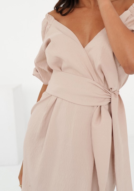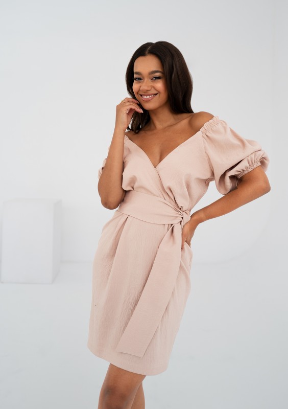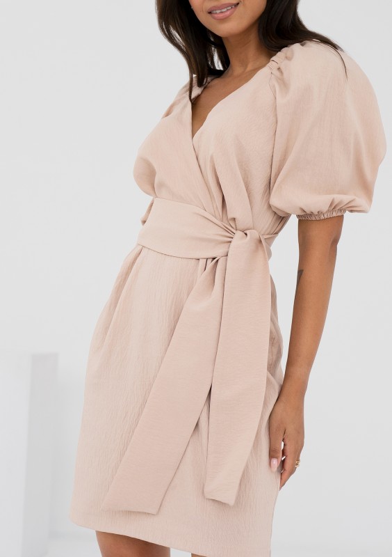 Subtelna sukienka mini z dekoltem kopertowym i wiązaniem w talii. Kreacja z delikatnie kreszowanej tkaniny w beżu.