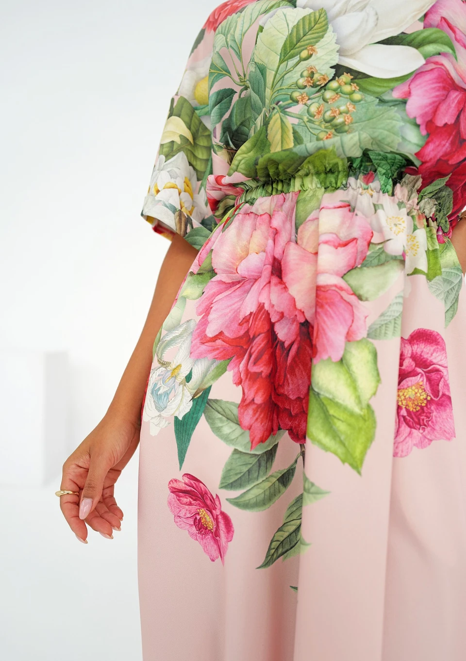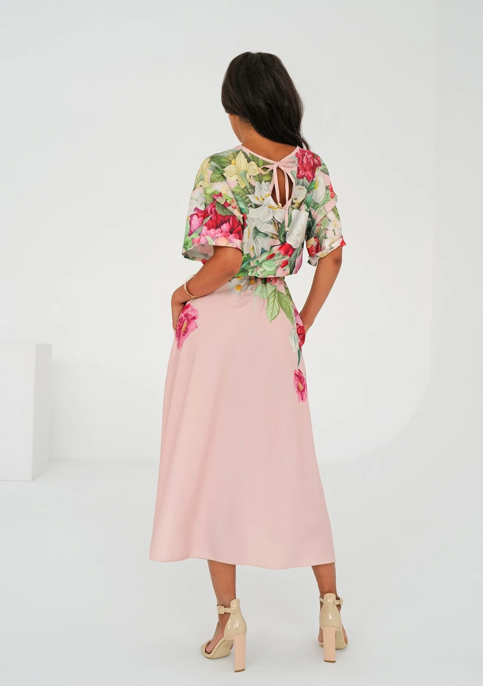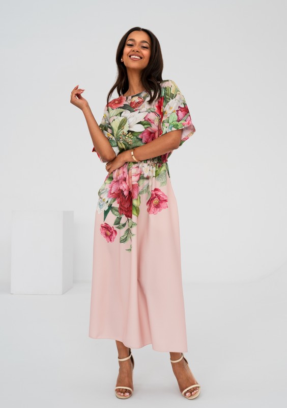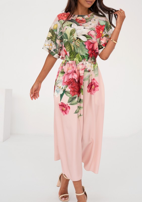 Pudrowa sukienka midi o wiosennym wzorze kwiatów. Uszyta z lekkiej i odpornej na gniecenie tkaniny. Wygodna kreacja została wyposażona w kieszenie.