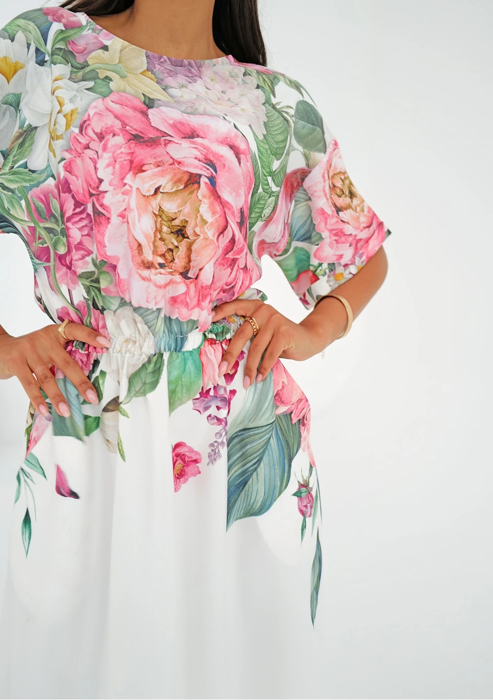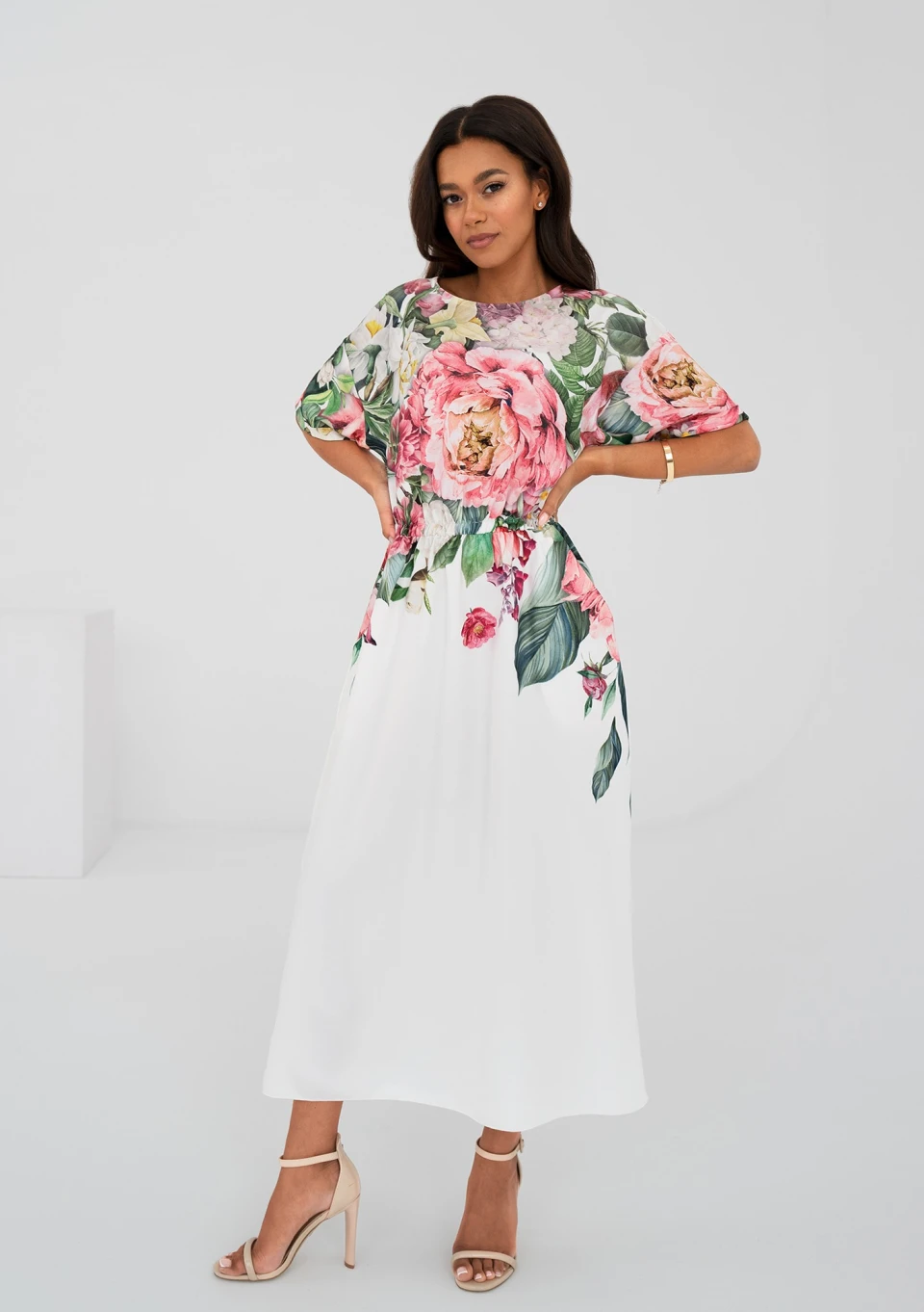 Koktajlowa sukienka midi w odcieniu ecrue, o wiosennym wzorze kwiatów. Uszyta z lekkiej, niegniotącej się tkaniny. Wygodna kreacja została wyposażona w kieszenie.