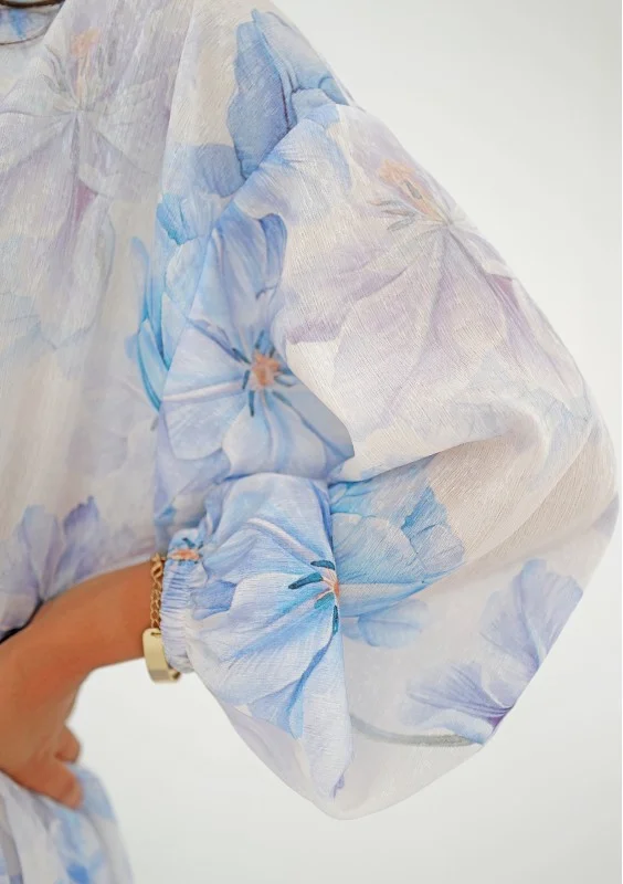 Rozkloszowana sukienka midi z wiosenną kompozycją niebieskich kwiatów na zwiewnej tkaninie. Model o uniwersalnym, bardzo wygodnym kroju.