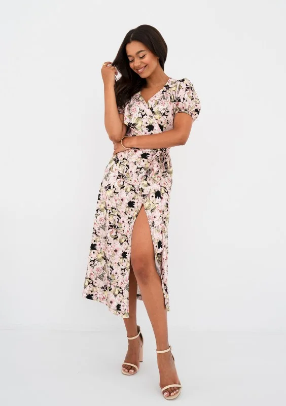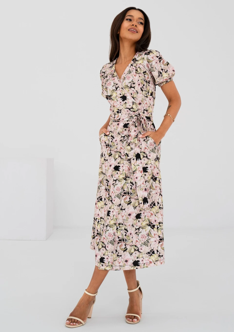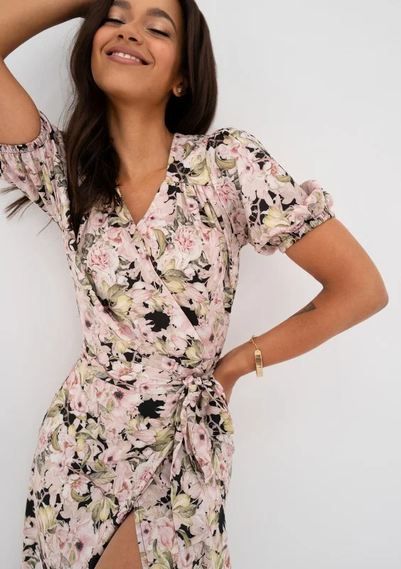 Kopertowa sukienka midi to wiosenna kreacja ze zwiewnej tkaniny, zdobiona drobnymi bufkami na krótkich rękawach i wzorem pudrowych kwiatów.