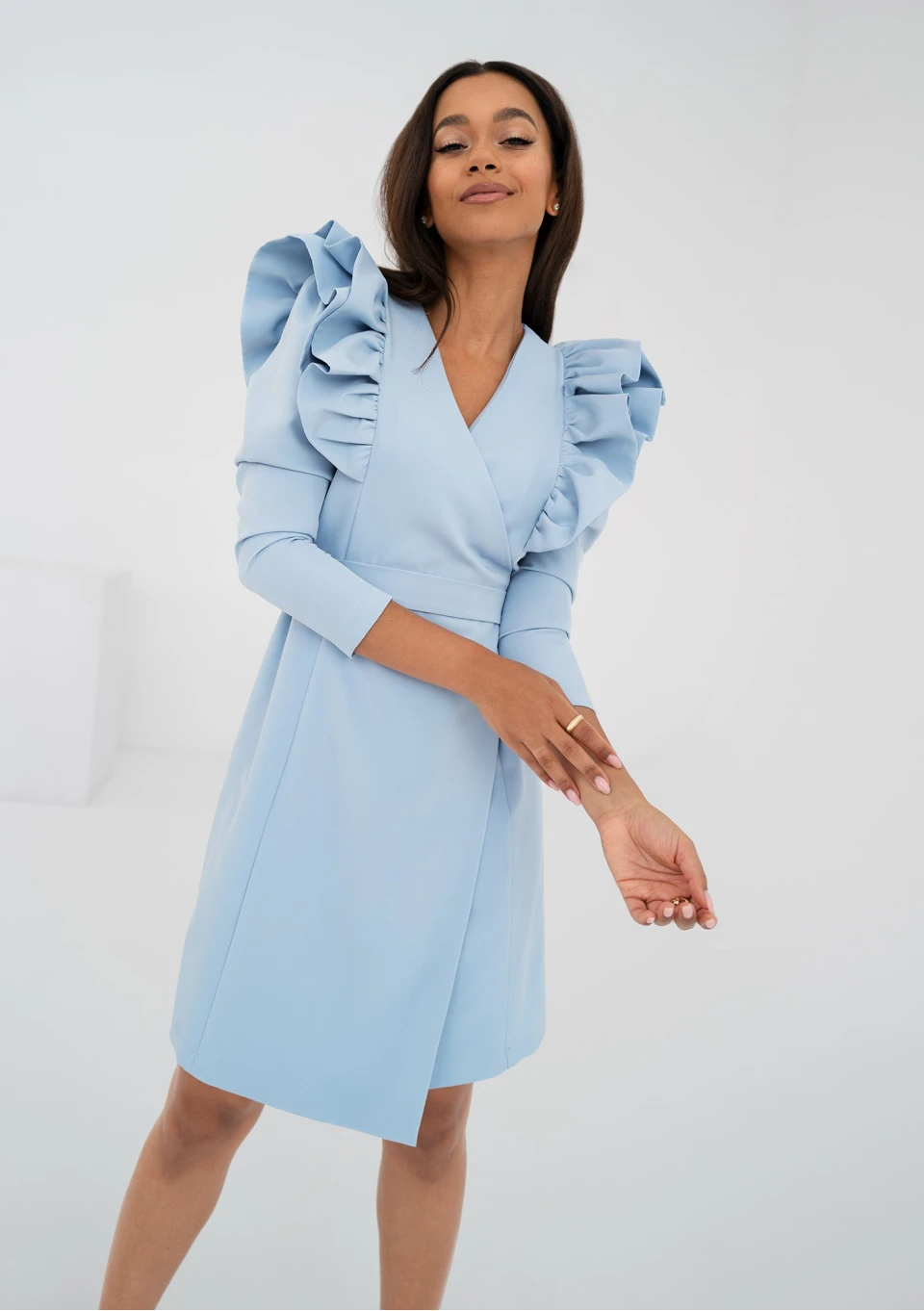 Błękitna sukienka kopertowa w eleganckim i stosownym do każdej okazji stylu. Cudnie ozdobiona efektownymi falbankami.