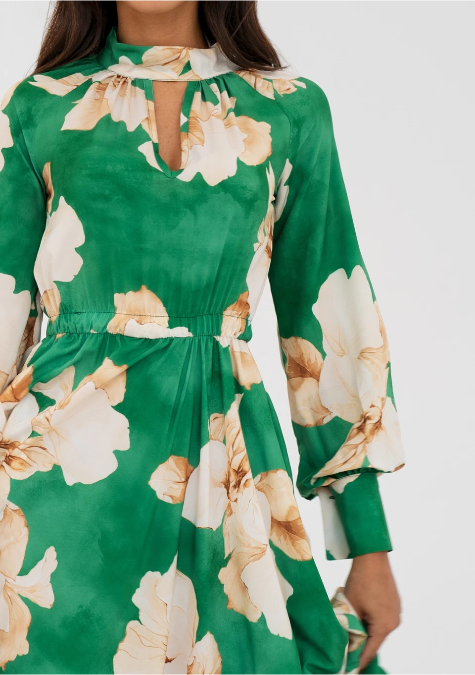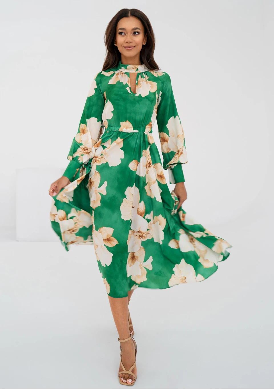 Koktajlowa sukienka midi w kwiaty uszyta ze zwiewnej tkaniny. Oczaruje soczystą zielenią i modnym wycięciem pod stójką dekoltu.