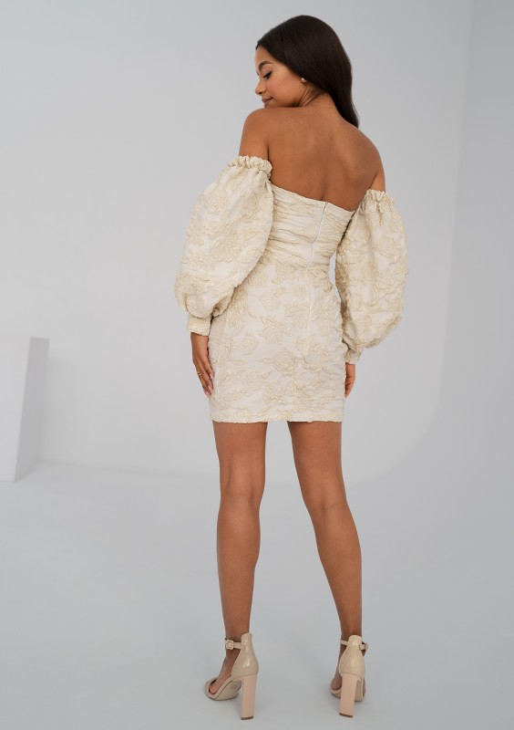 Zmysłowa sukienka mini o gorsetowym kroju. Efektowny styl współtworzą obniżone rękawy i romantyczny, kwiatowy motyw żakardu w kremowej bieli ecru.