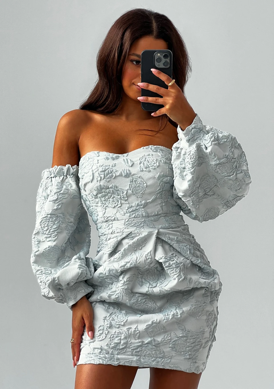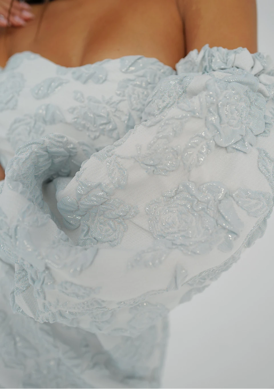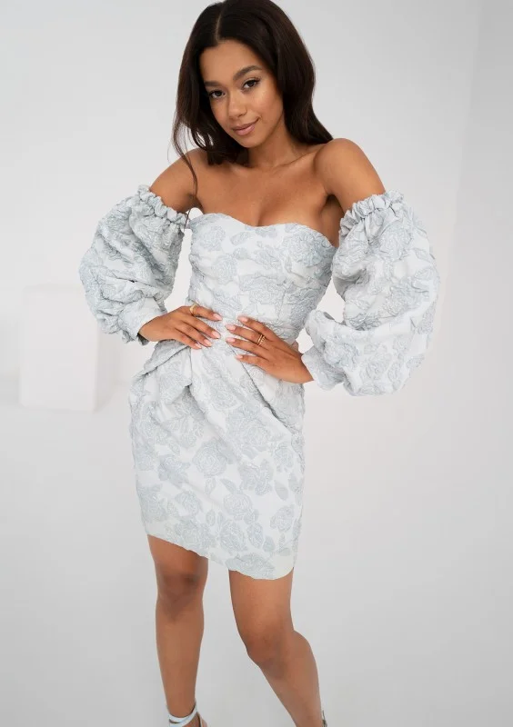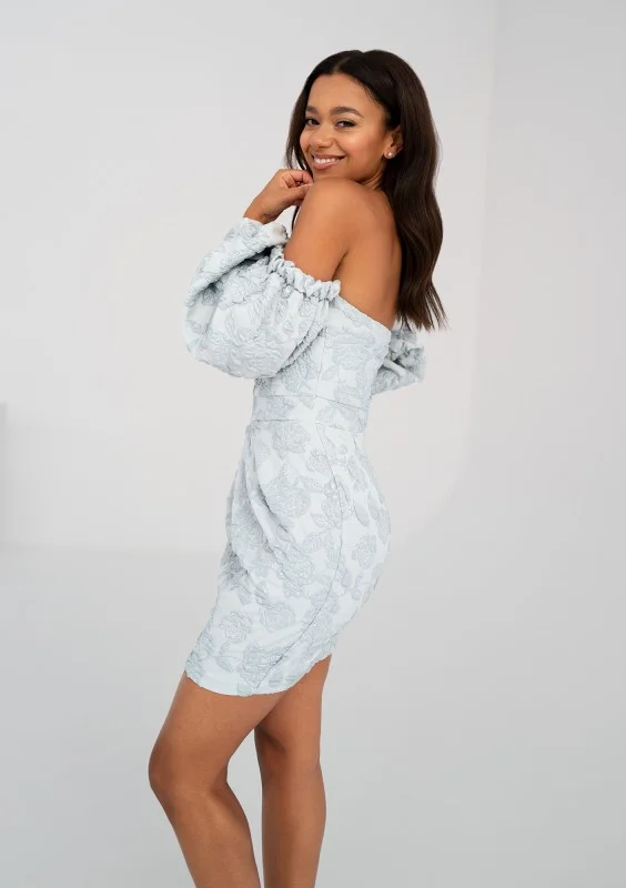 Zmysłowa sukienka mini o gorsetowym kroju. Efektowny styl współtworzą obniżone rękawy i romantyczny, kwiatowy motyw żakardu w błękicie.