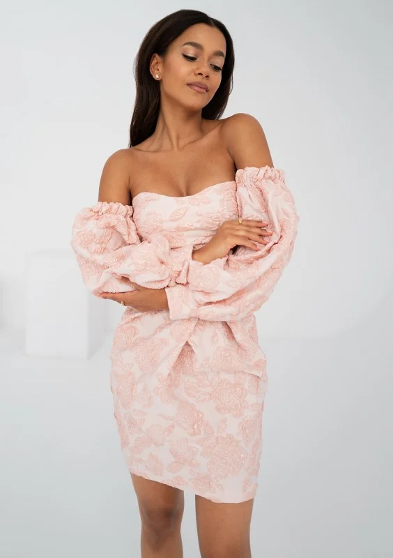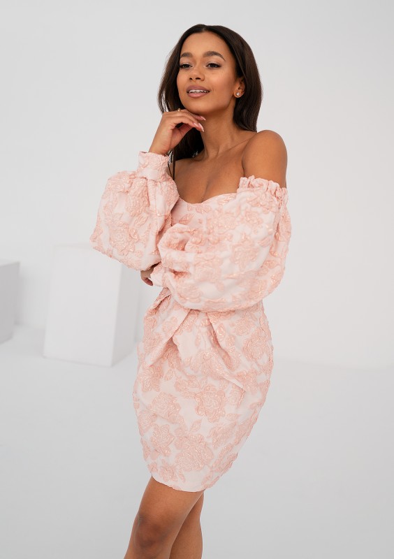 Zmysłowa sukienka mini o gorsetowym kroju. Efektowny styl współtworzą obniżone rękawy i romantyczny, kwiatowy motyw żakardu w pudrowym różu.