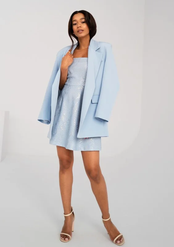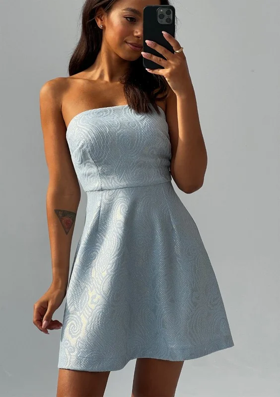 Rozkloszowana sukienka mini bez ramiączek z dekoracyjnym, błękitnym żakardem. Przepięknie błyszczy i podkreśla sylwetkę. Zapinana dyskretnym suwakiem na plecach.