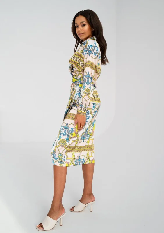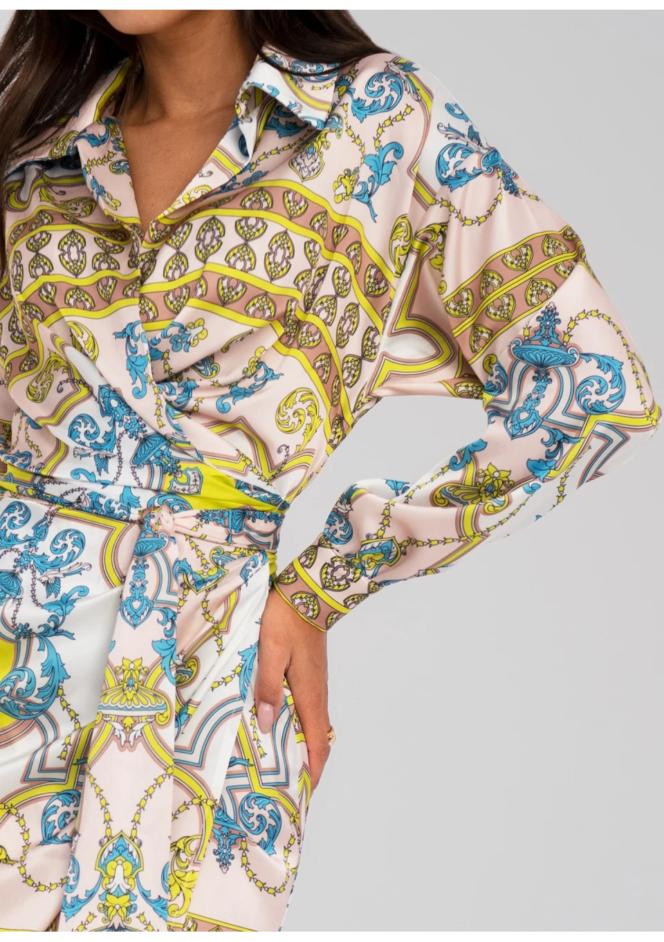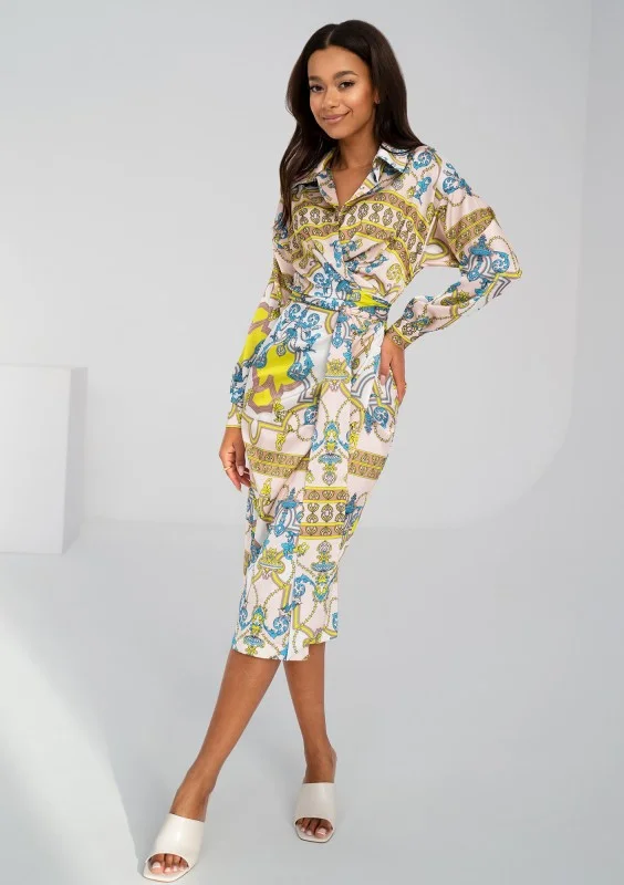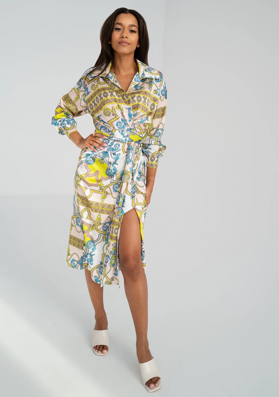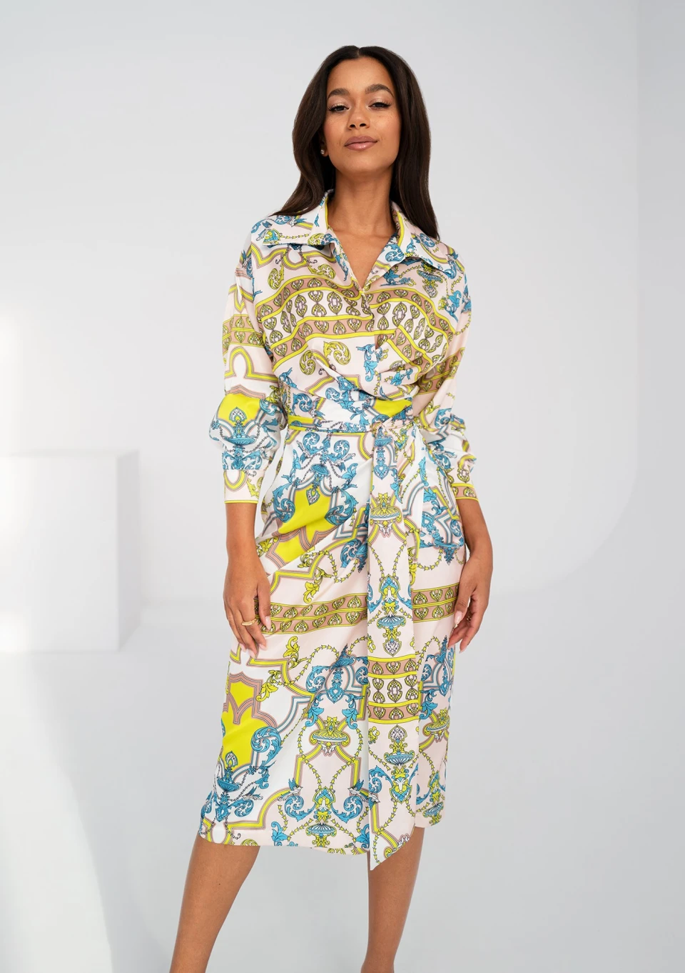 Kopertowa sukienka zdobiona ornamentalnym wzorem. Kreacja o koszulowym kroju, z kołnierzykiem i mankietami w rękawach.