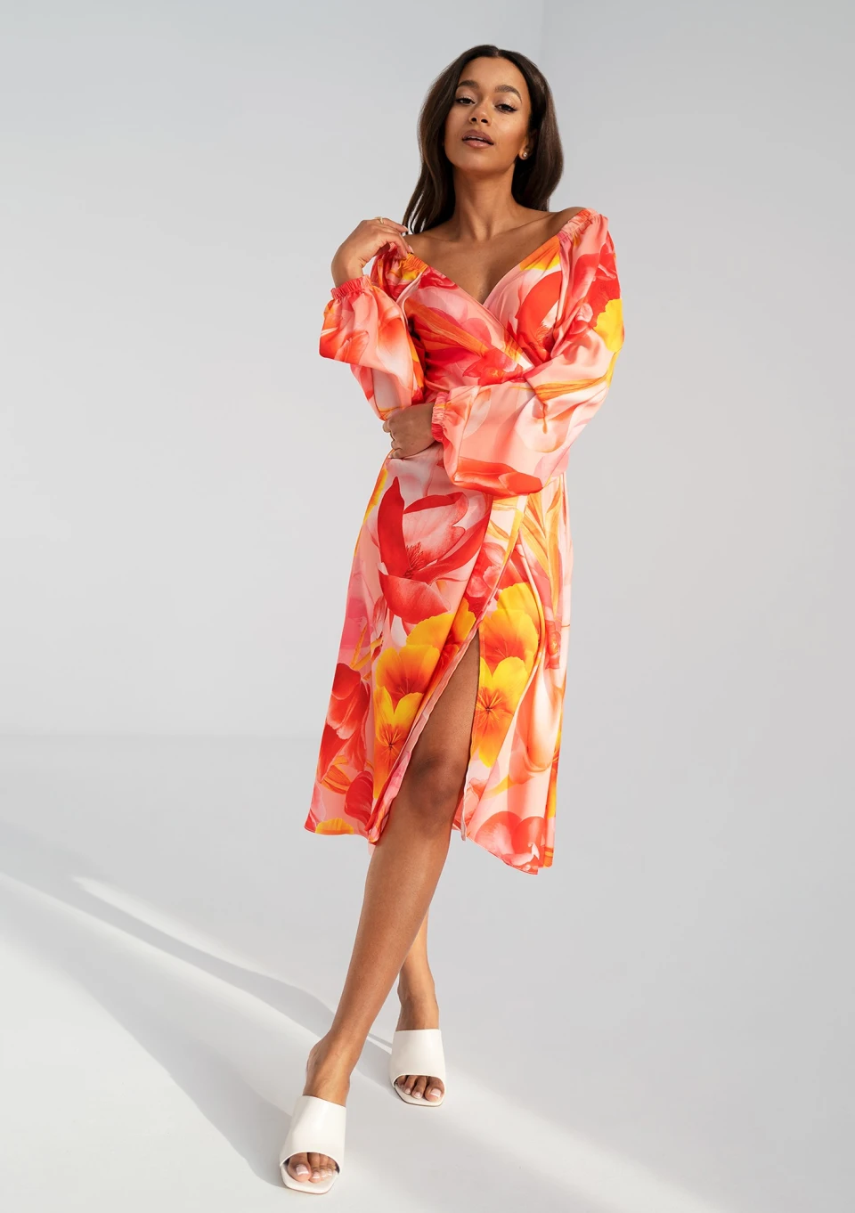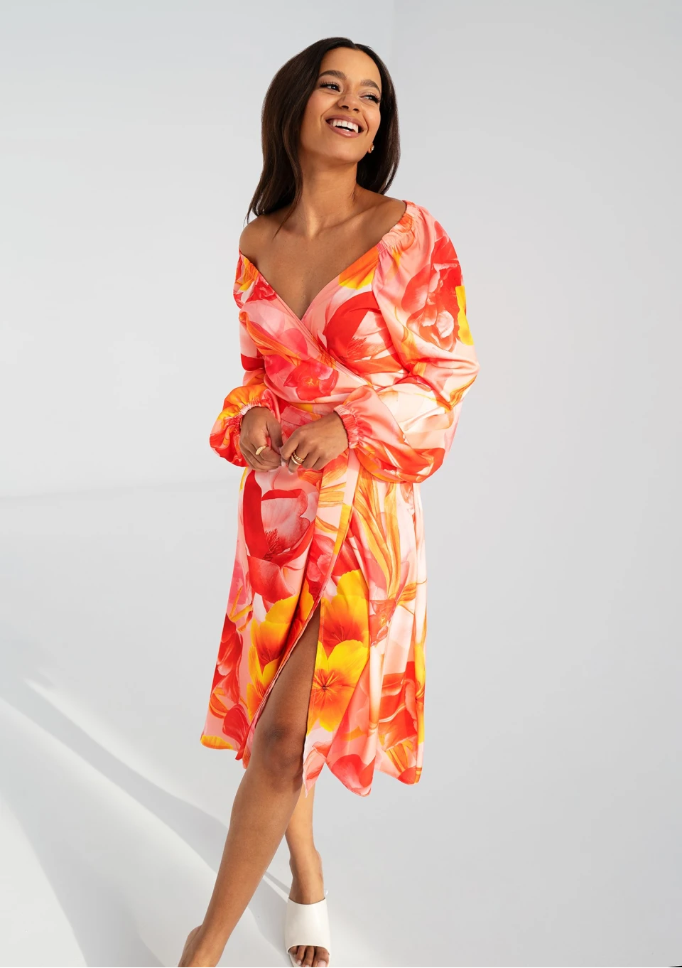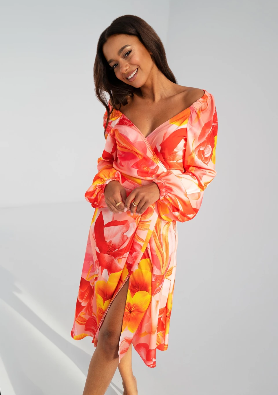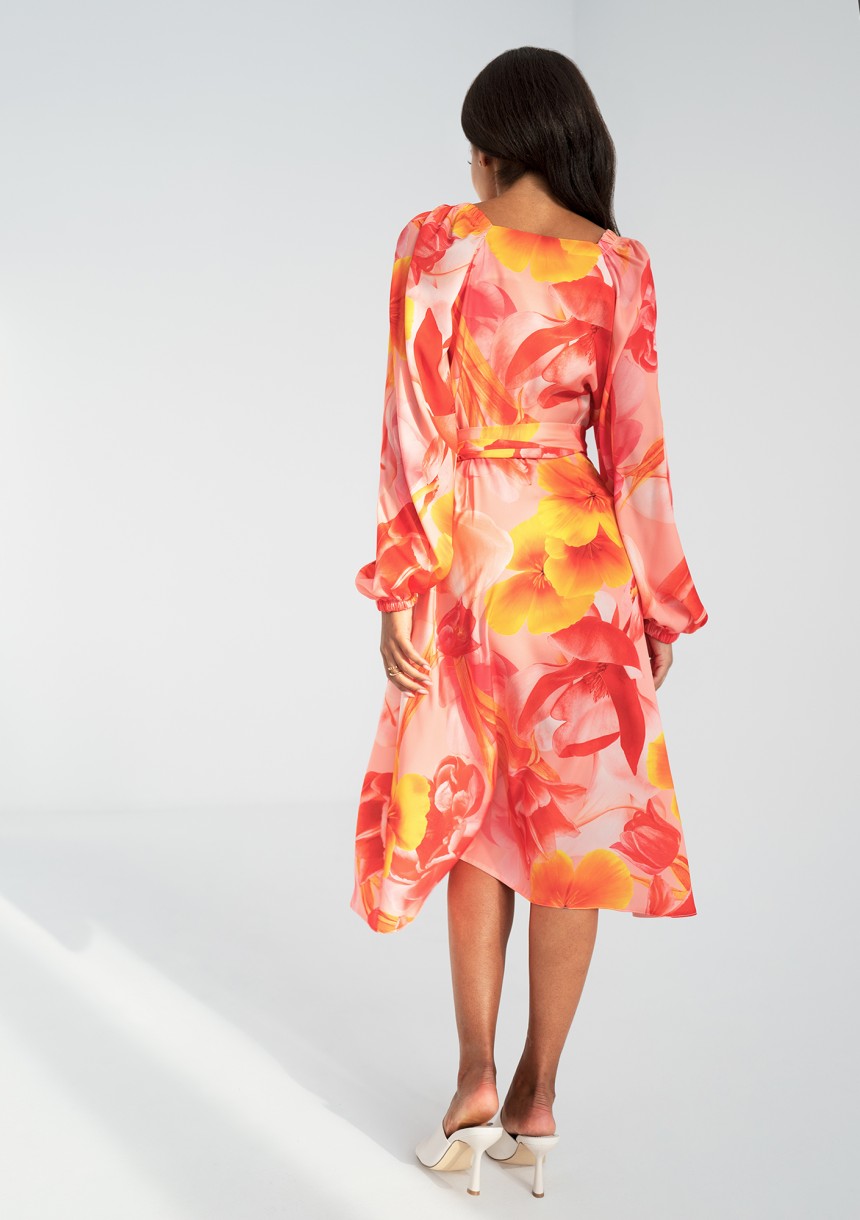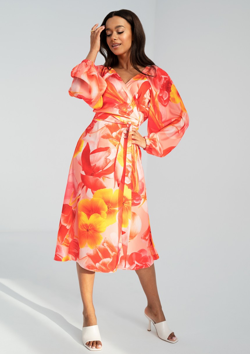 Elegancka sukienka kopertowa w kwiaty. Kreacja z możliwością osunięcia rękawów pozwala zaprezentować się w wyjątkowym wydaniu.