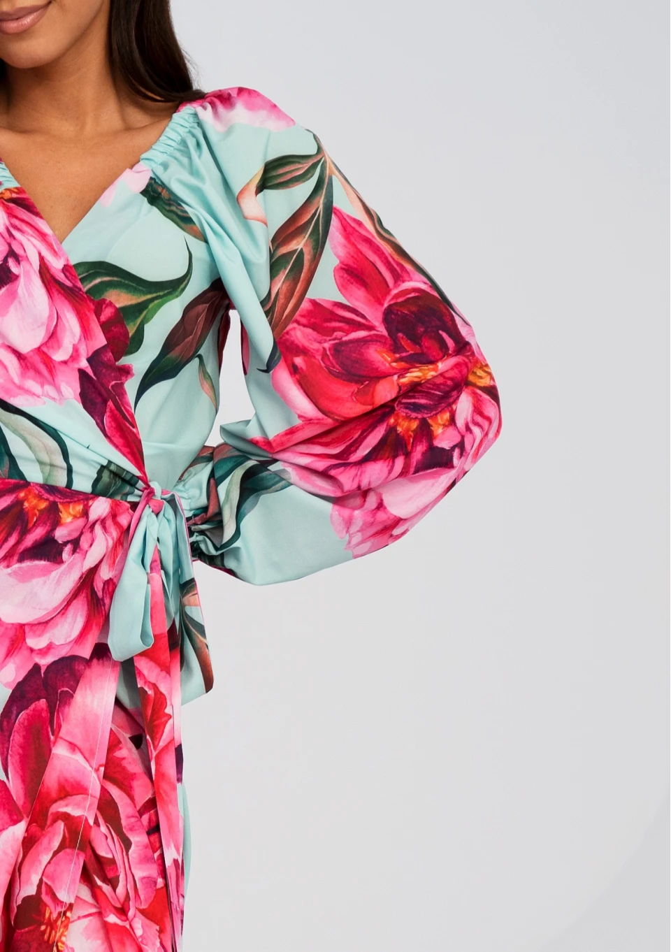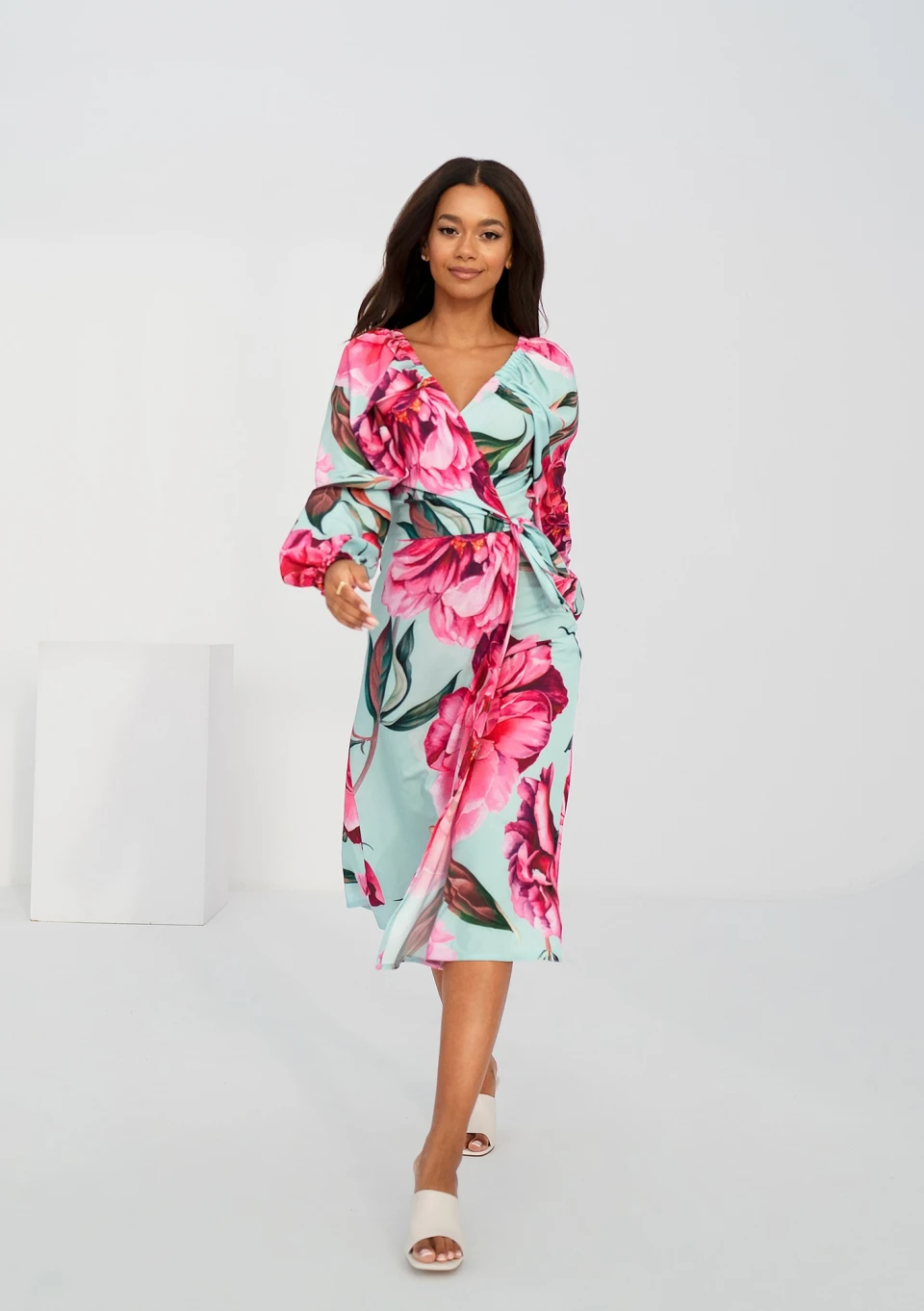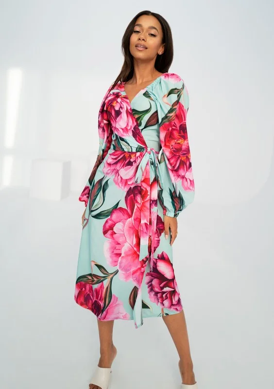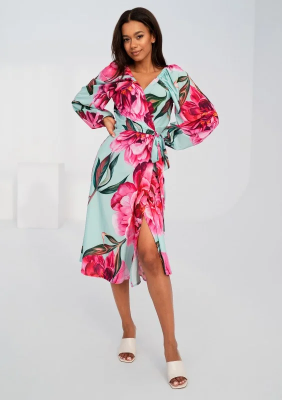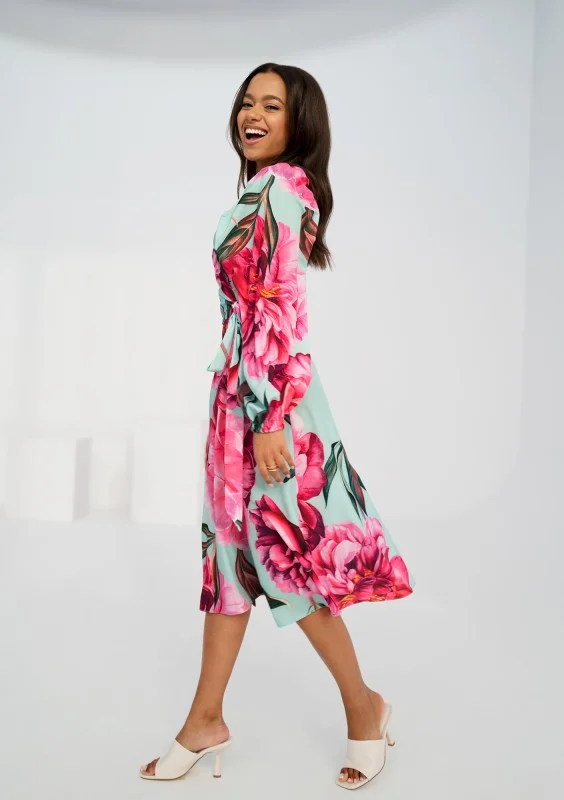 Kopertowa sukienka midi z piękną kompozycją piwonii. Kreacja z możliwością osunięcia rękawów.