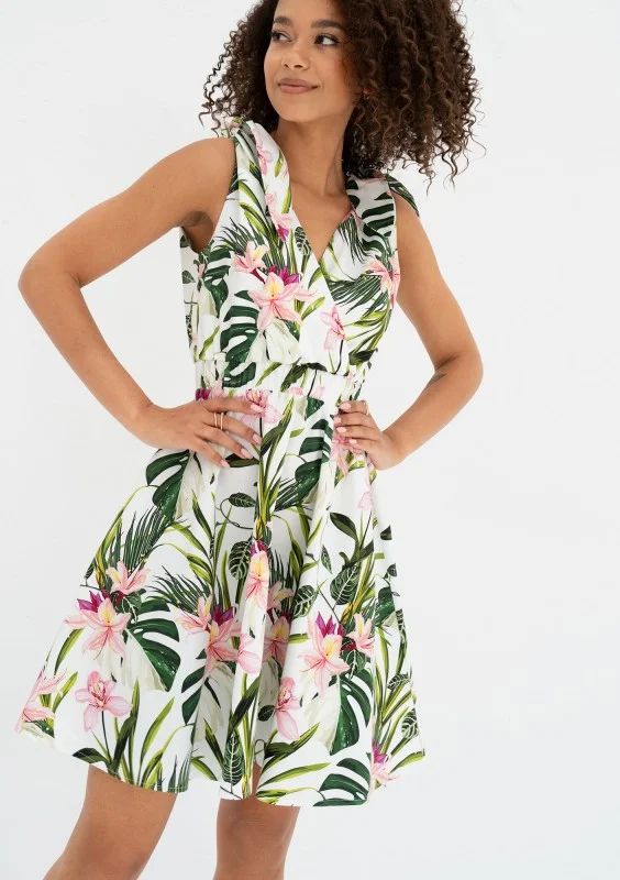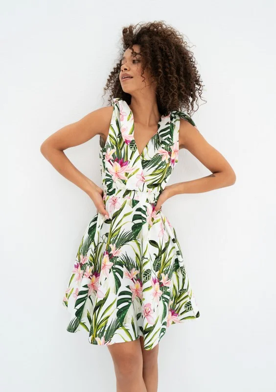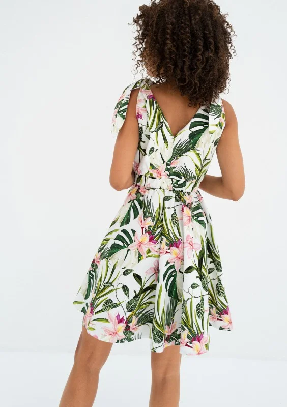Letnia sukienka koktajlowa z bawełny, delikatnie zdobiona wzorem liści. Romantycznie rozkloszowana, z wiązanymi ramiączkami i kopertowym dekoltem.