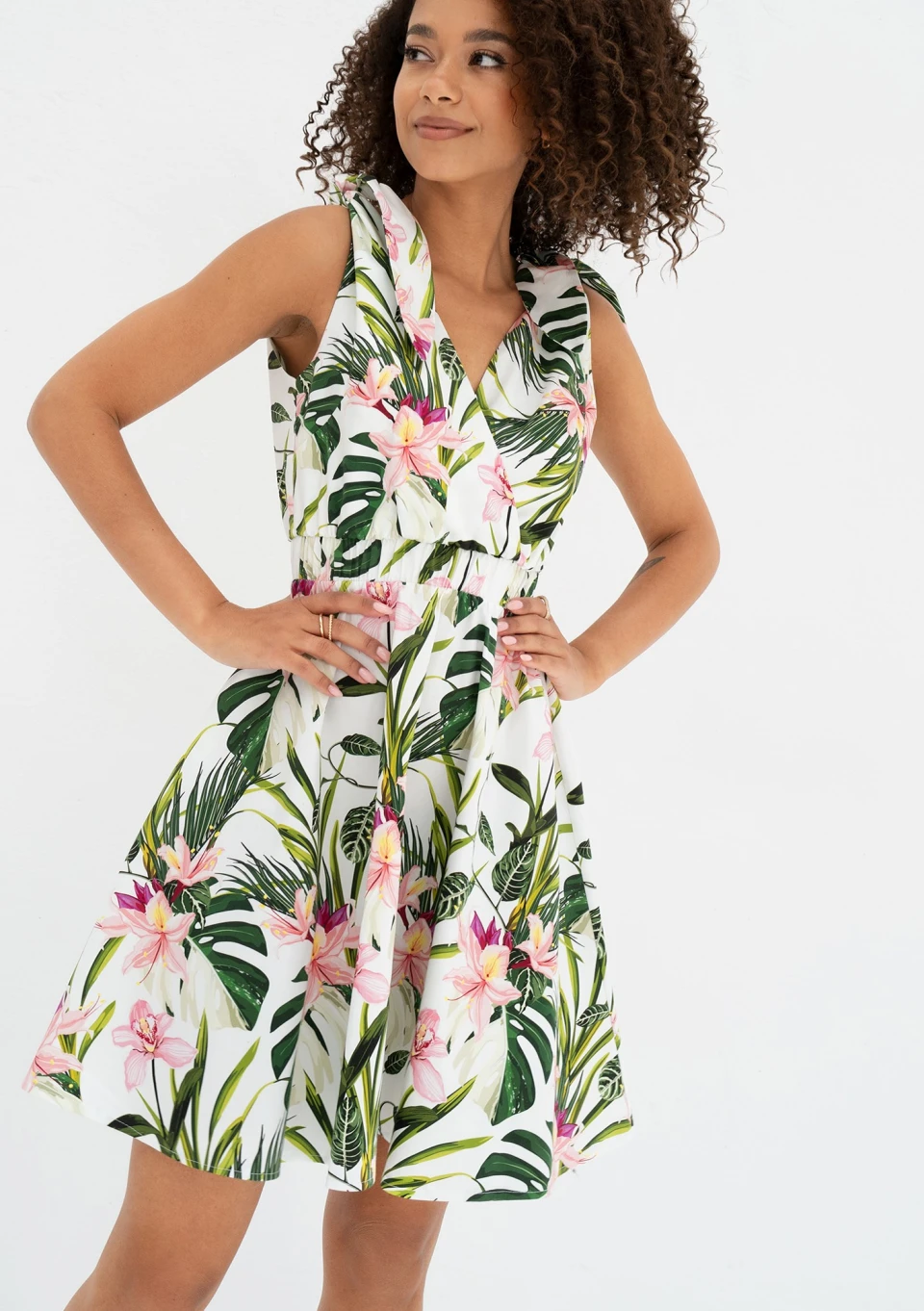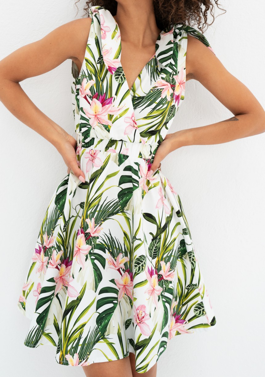 Fason mini, rozkloszowany, z gumką w talii, kopertowym dekoltem i wiązanymi ramiączkami.