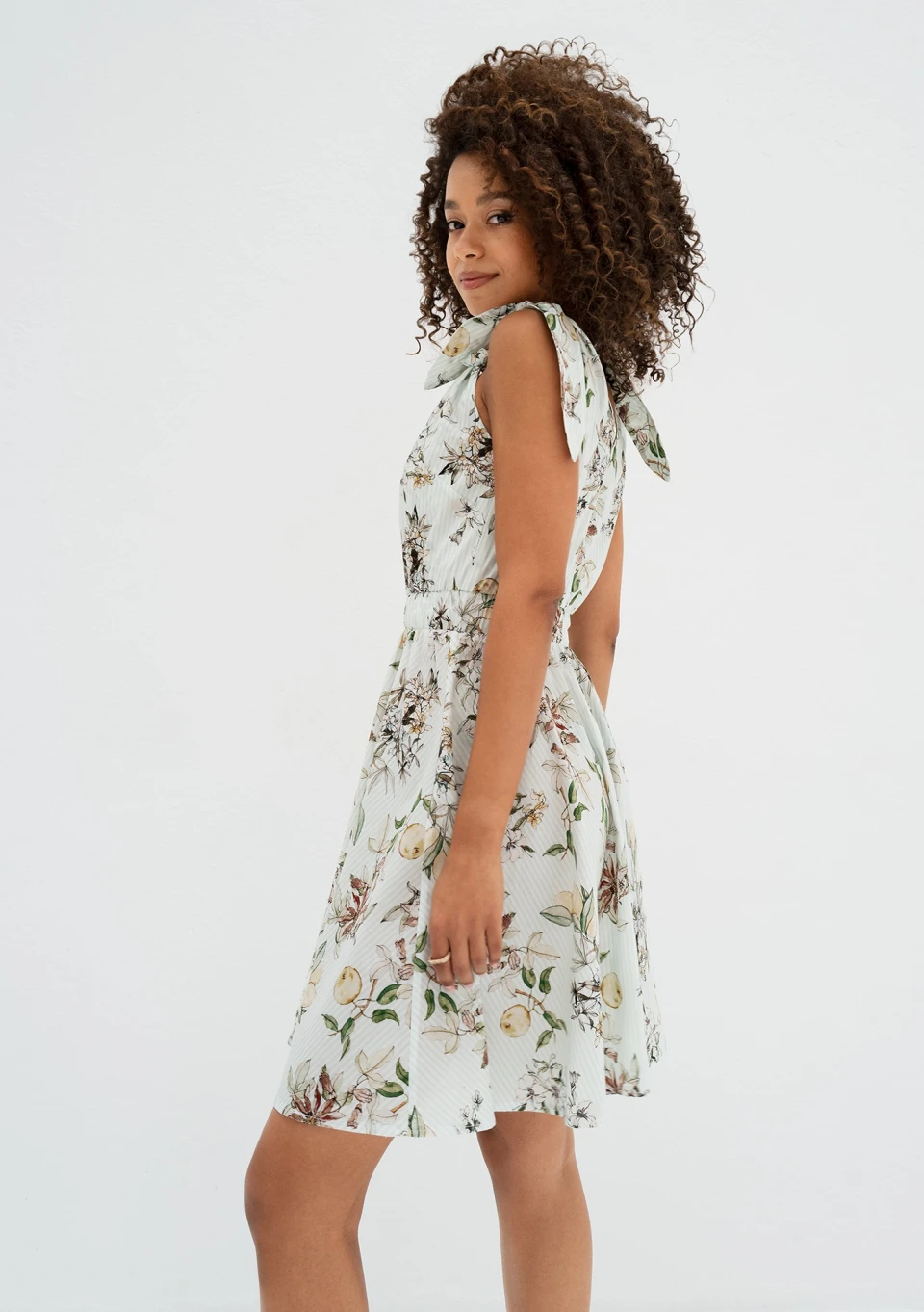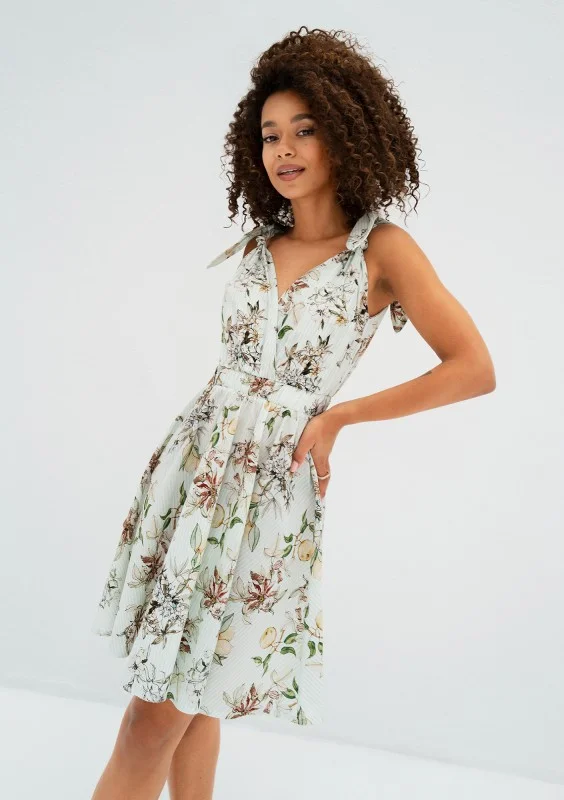 Fason mini, rozkloszowany, z gumką w talii, kopertowym dekoltem i wiązanymi ramiączkami.