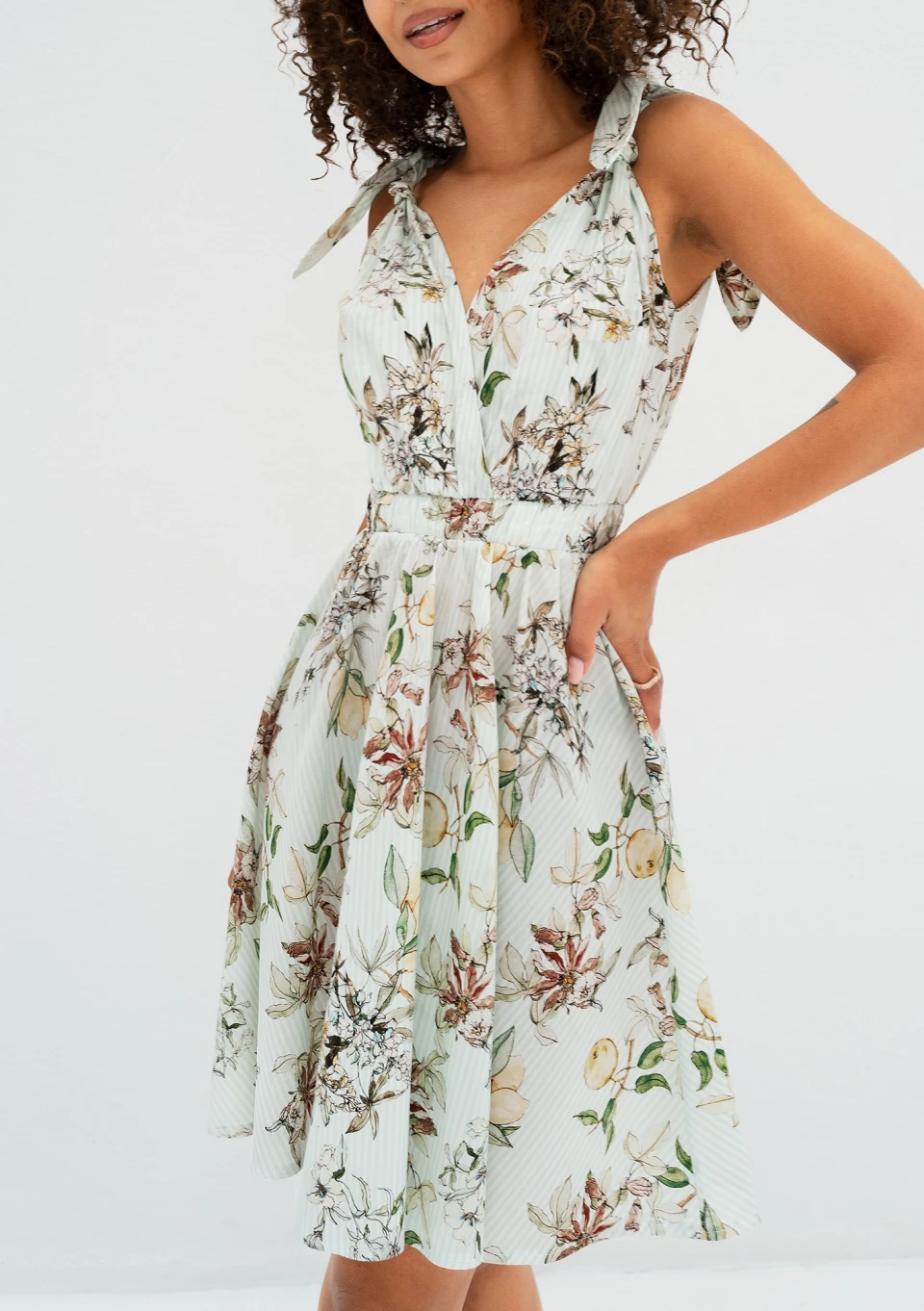 Letnia sukienka koktajlowa z bawełny, delikatnie zdobiona wzorem kwiatków i prążków. Romantycznie rozkloszowana, z wiązanymi ramiączkami i kopertowym dekoltem.