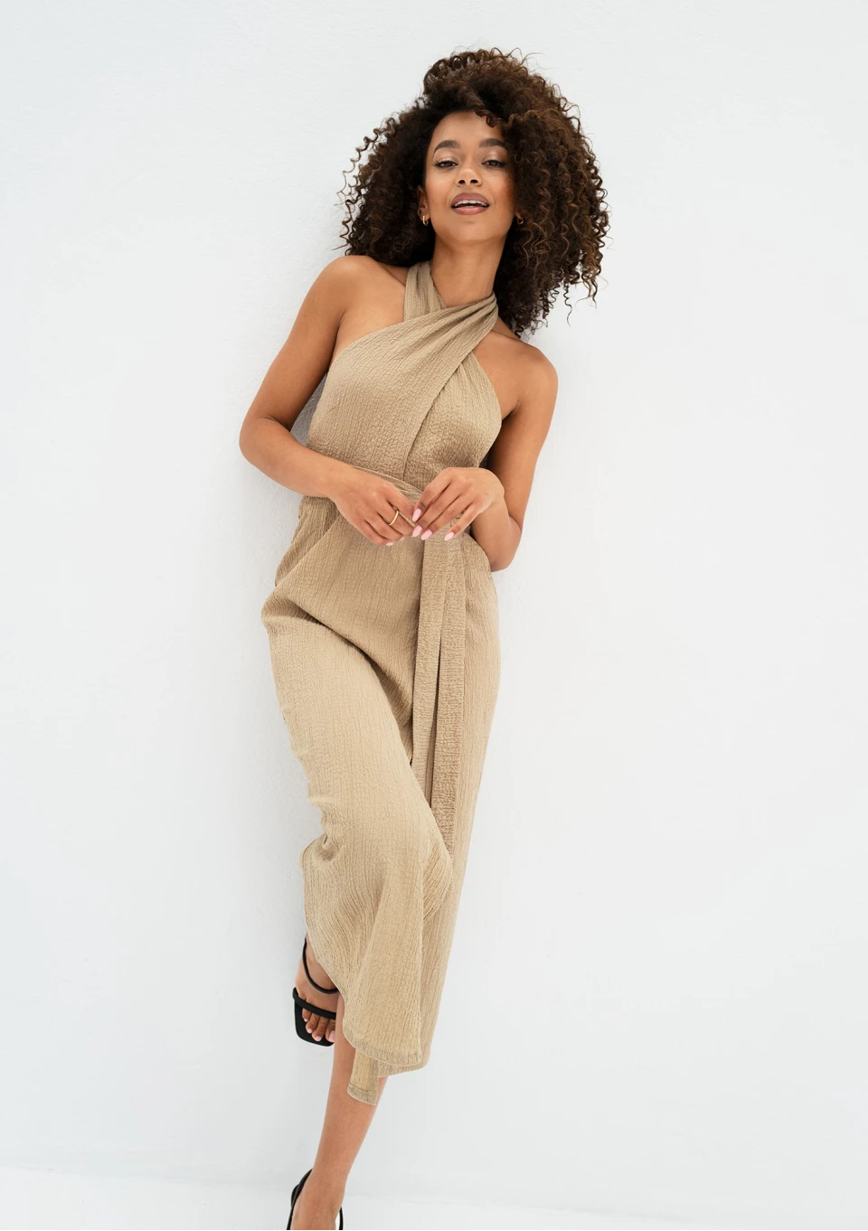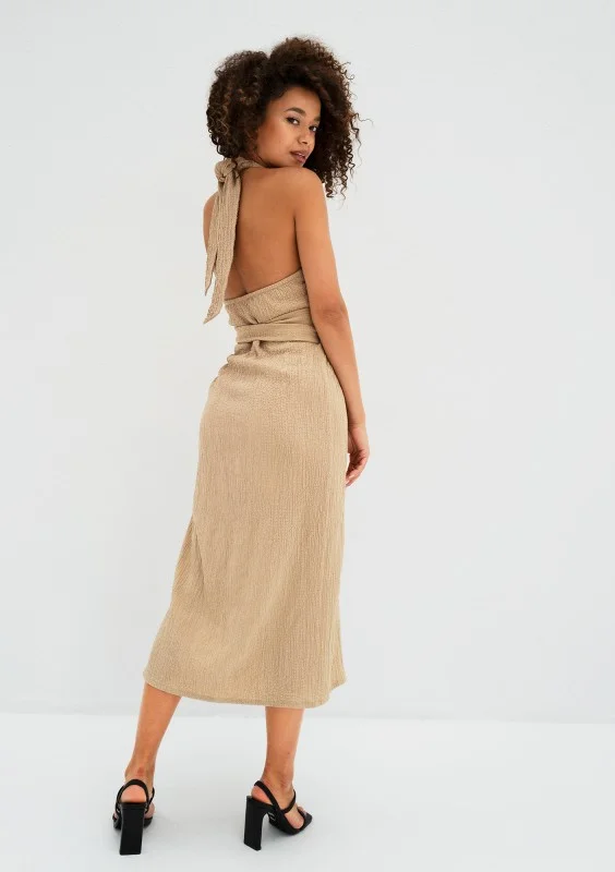 Beżowa sukienka midi na lato, uszyta ze zwiewnej, kreszowanej tkaniny z wiskozą. Zakładana kopertowo, wiązana w talii i na szyi.
