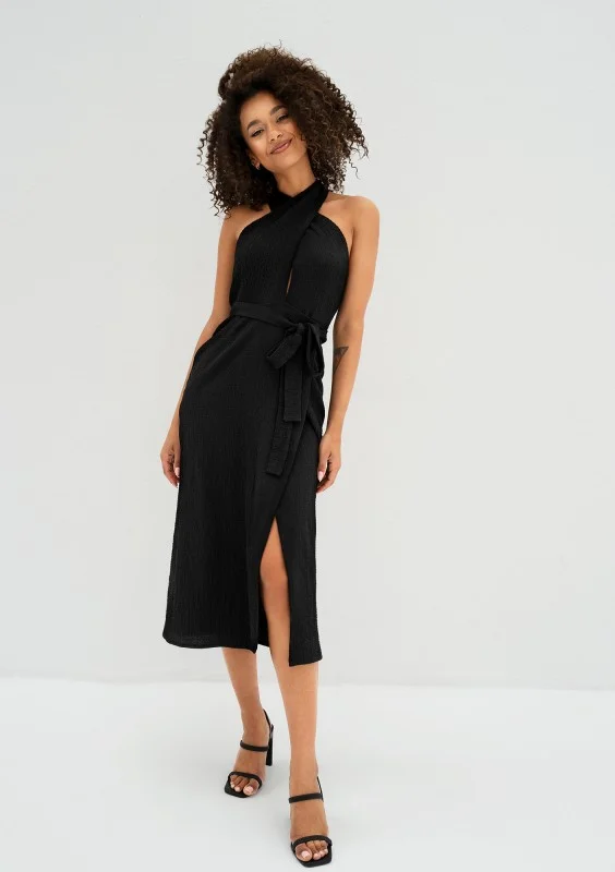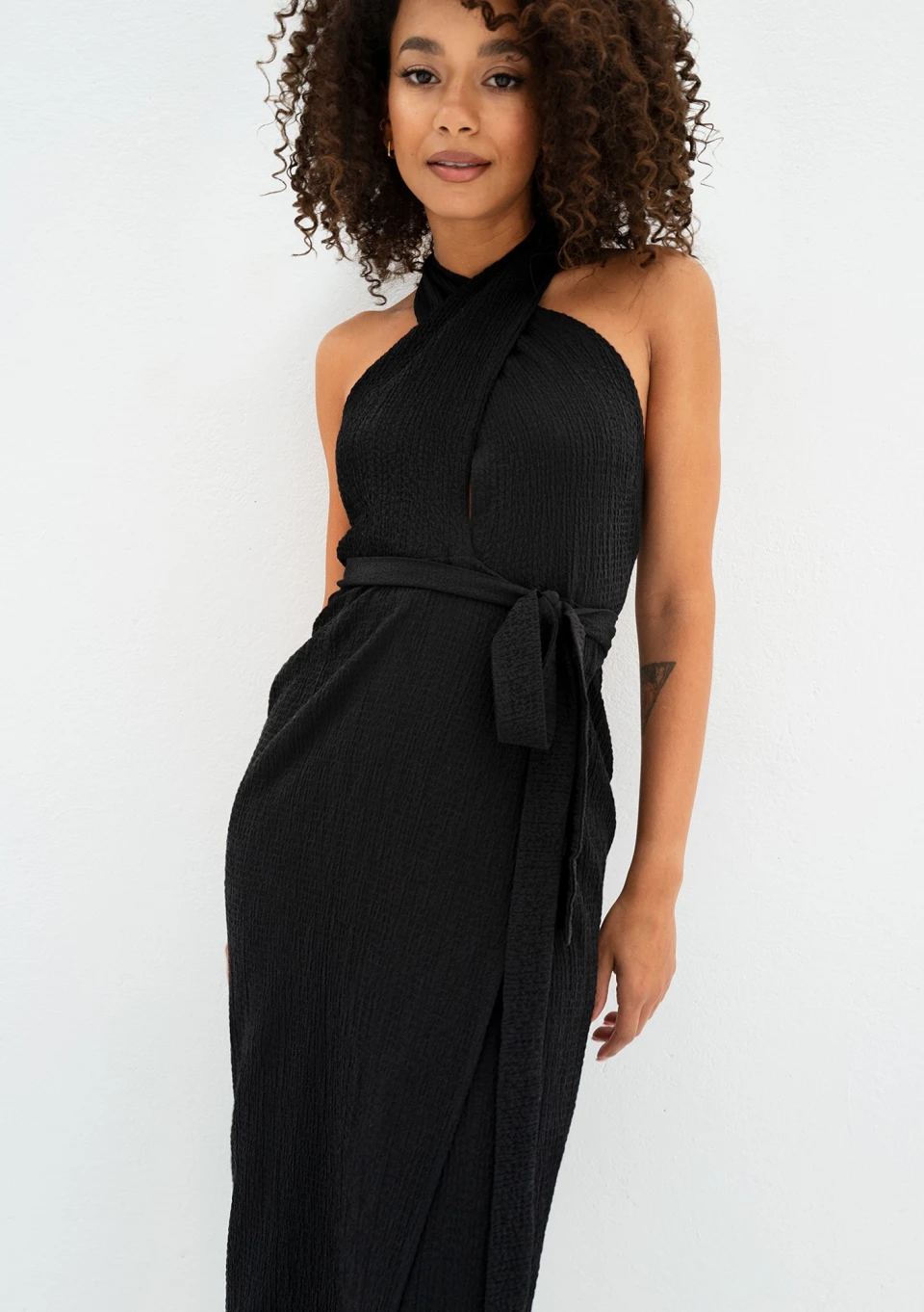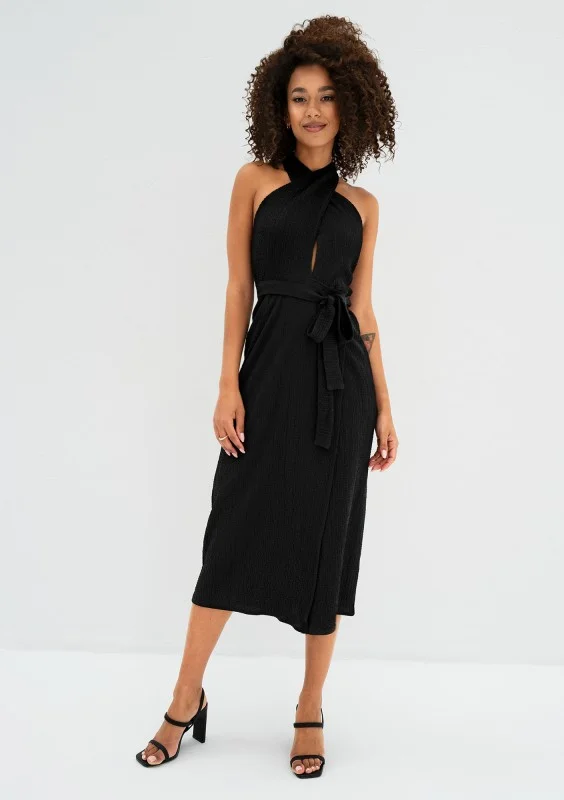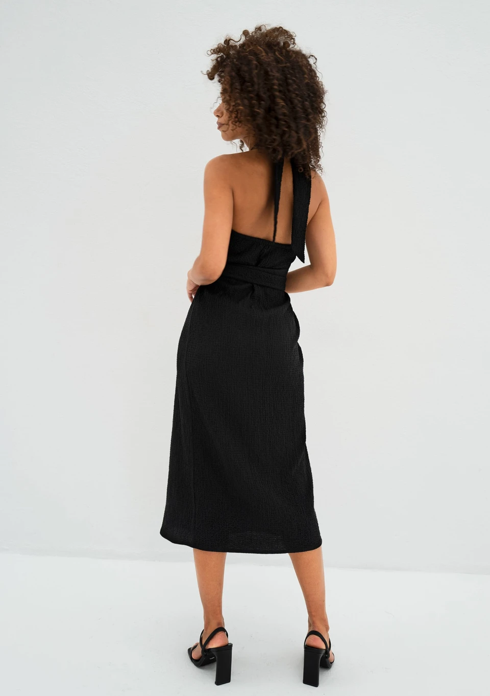 Czarna sukienka midi na lato, uszyta ze zwiewnej, kreszowanej tkaniny z wiskozą. Zakładana kopertowo, wiązana w talii i na szyi.