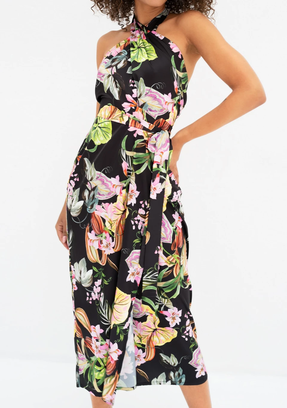 Czarna sukienka z dekoltem wiązanym wokół szyi, zdobiona kwiatowym wzorem. Pasek podkreśla talię, lecz kreacja zachowuje delikatnie luźną formę. O komplementy poprosi się subtelny zarys sylwetki i śmiała ekspozycja pleców i ramion. To sukienka koktajlowa dla miłośniczek modnego dekoltu typu halter.