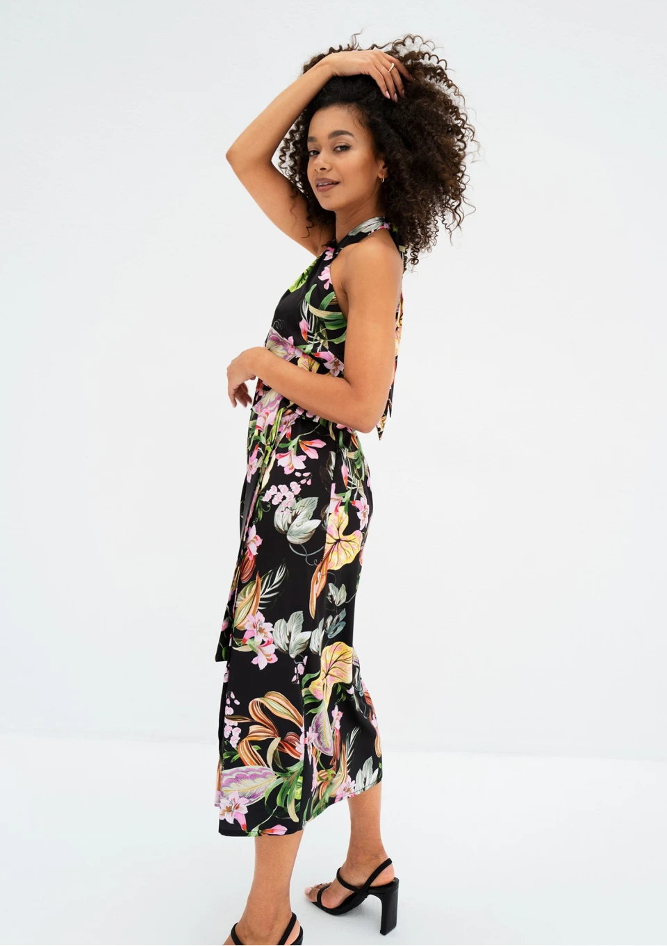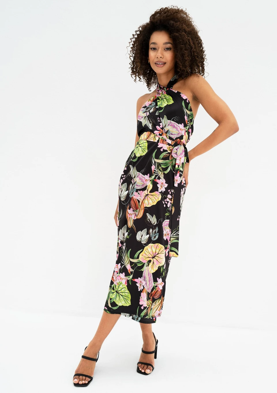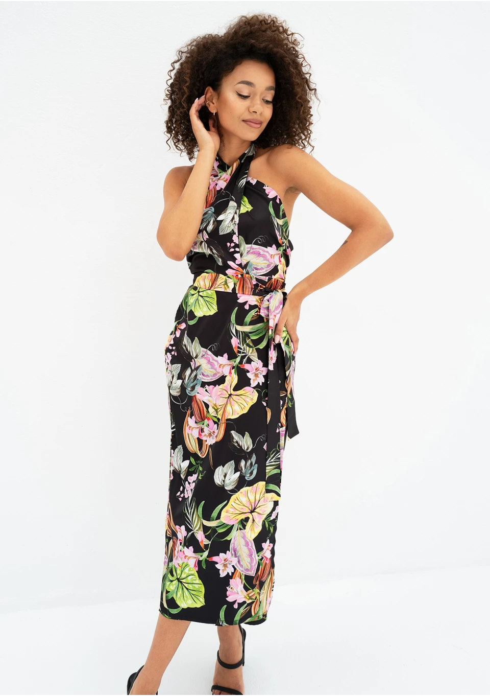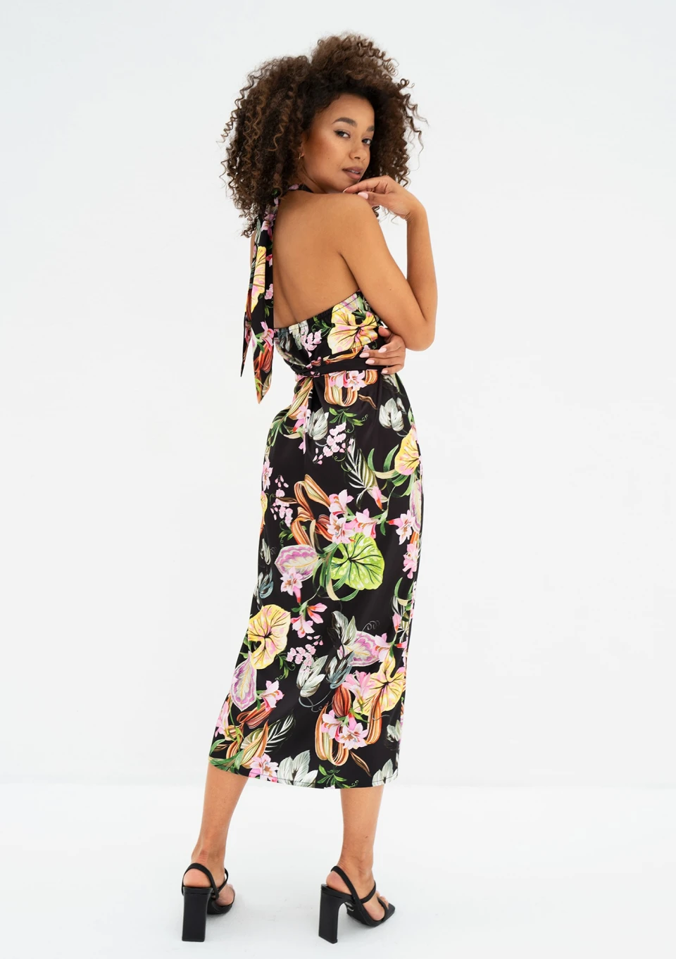 Czarna sukienka letnia w kwiaty o długości midi, uszyta z gładkiej tkaniny z wiskozą. Zakładana kopertowo, wiązana w talii i na szyi.