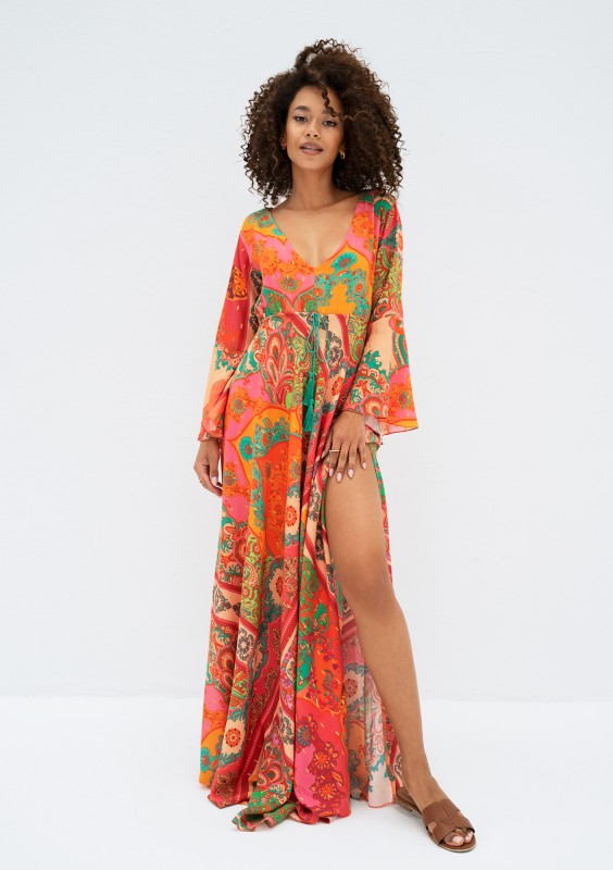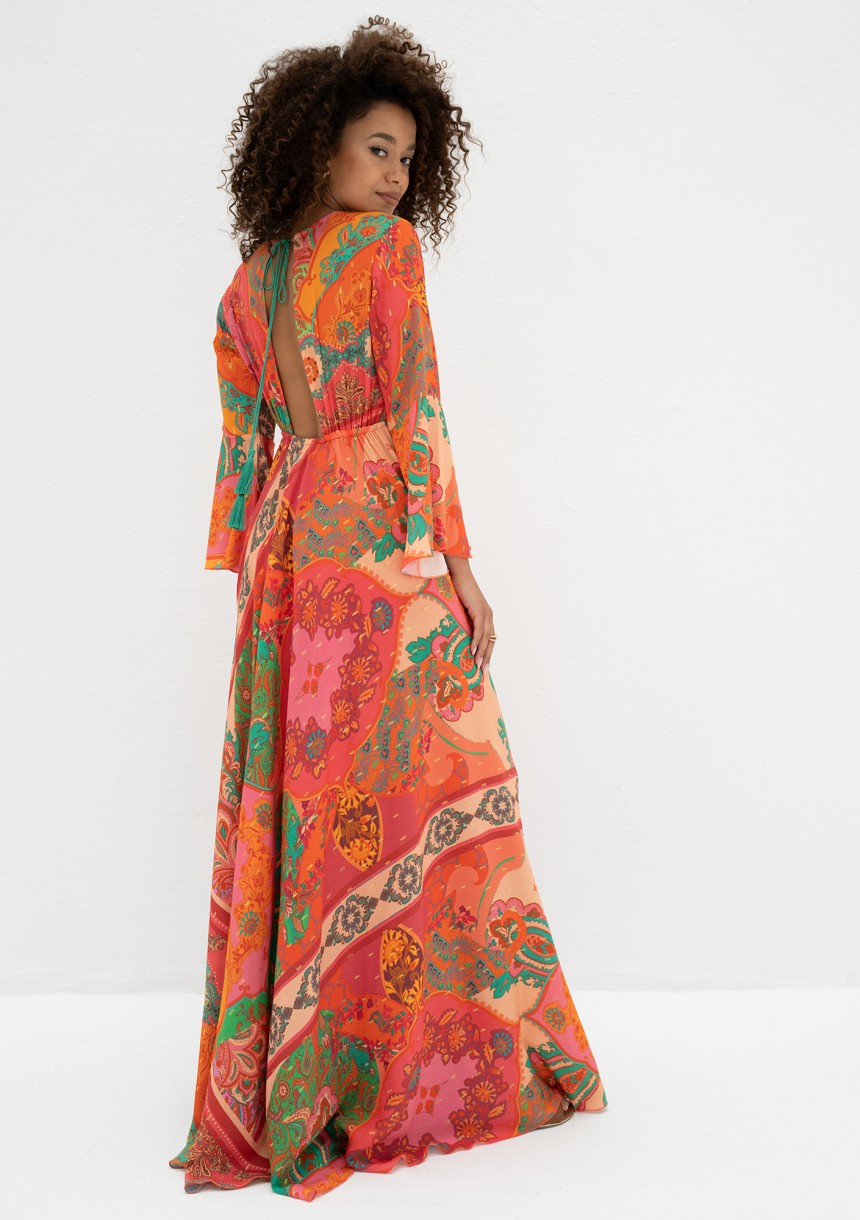 Długa sukienka boho na lato z pięknym, kolorowym wzorem i chwostami. Odsłania dekolt i plecy. Wykonana ze zwiewnej wiskozy, idealna na wakacje i upalne dni.