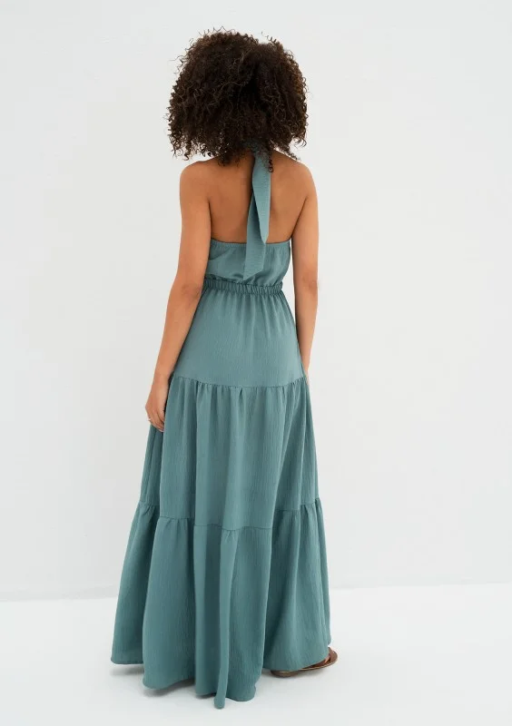 Długa sukienka letnia dla miłośniczek stylu boho. Kreacja w miętowym odcieniu eksponuje ramiona i plecy. Dodatkowo zachwyca skosami dekoltu i drobnym odkryciem talii.