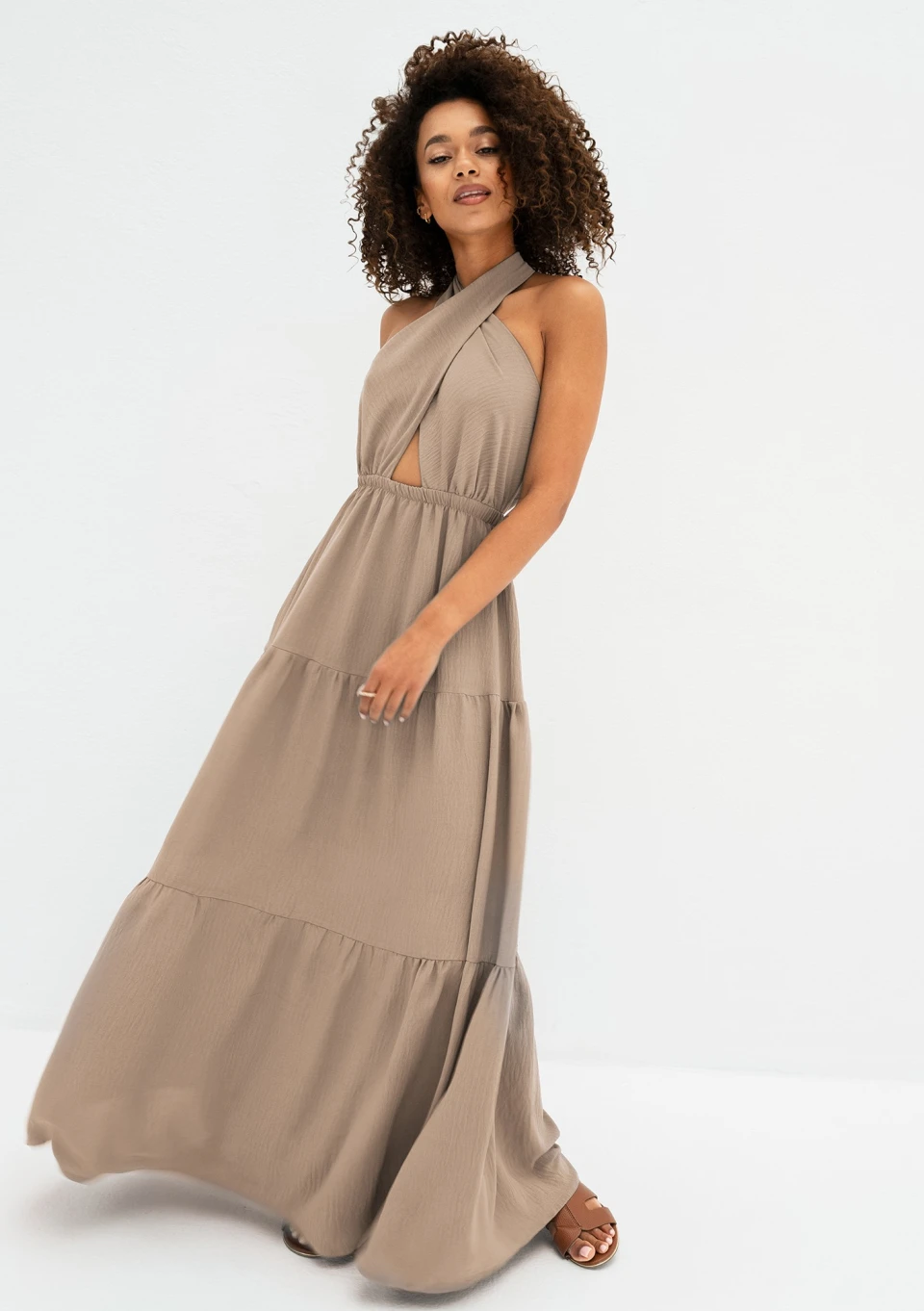 Zwiewna sukienka maxi w stylu boho. Letnia kreacja w uniwersalnym beżu, zmysłowo odsłaniająca ramiona i plecy. Dodatkowo zachwyca skosami dekoltu i drobną ekspozycją talii.