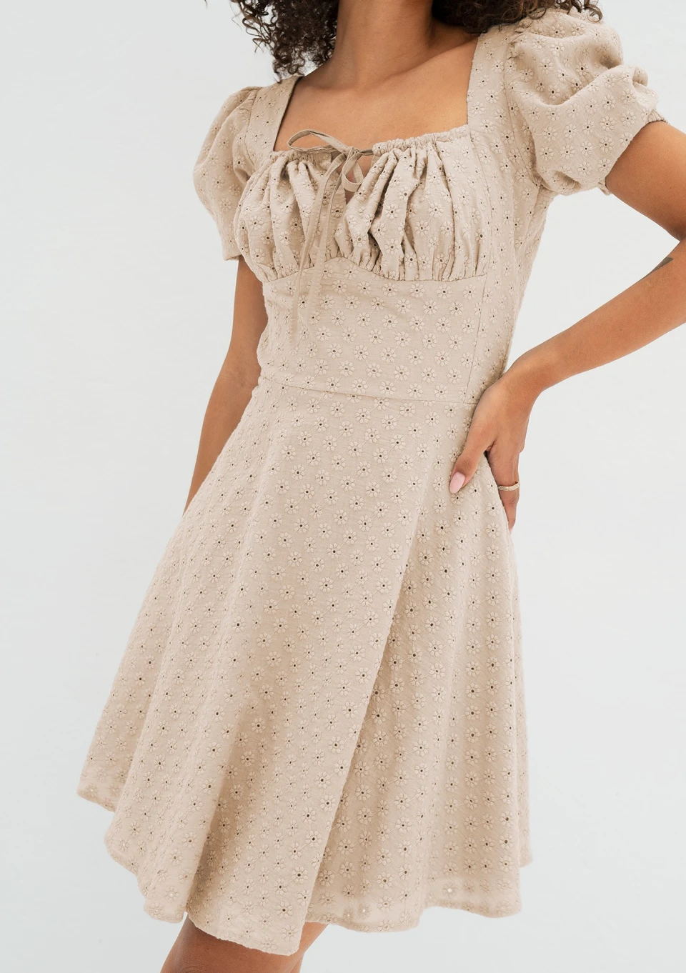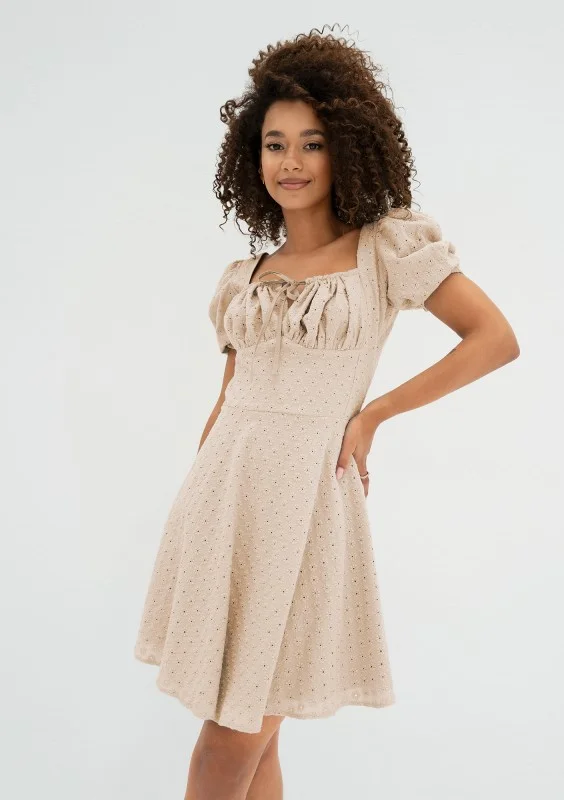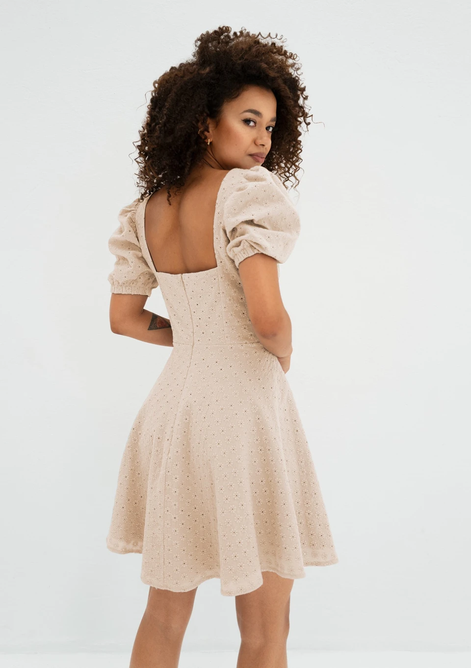 Letnia, beżowa sukienka mini z delikatnym, ażurowym wzorem. Model o rozkloszowanym kroju z zalotnym dekoltem i drobną bufką na rękawkach. Śliczna kreacja z nutą romantyzmu.