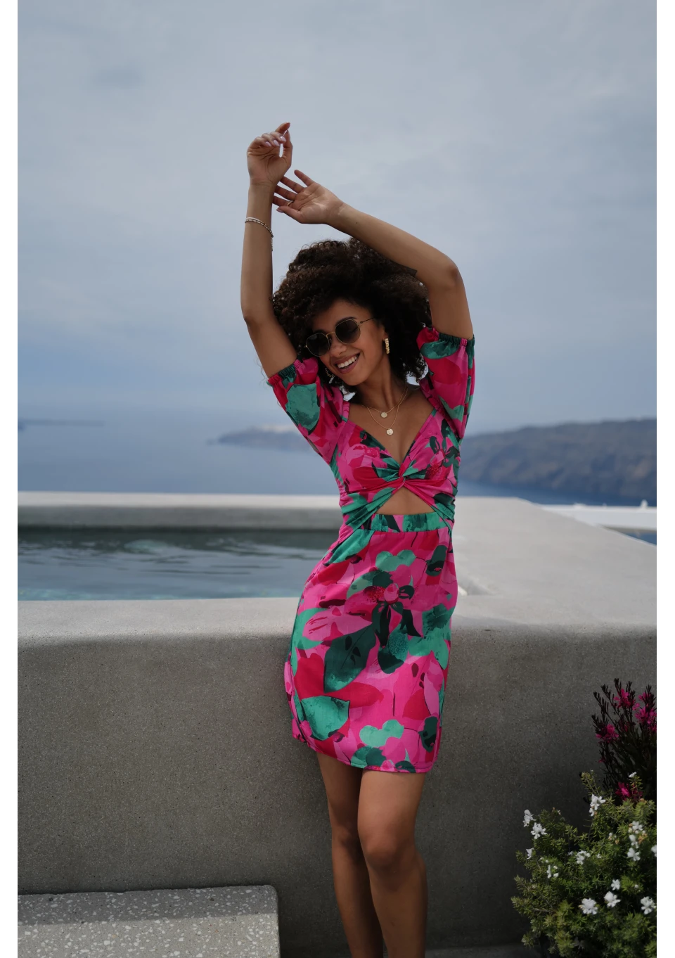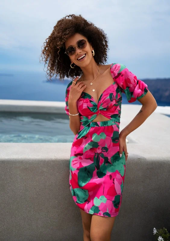 Zmysłowa sukienka koktajlowa z kwiatowym motywem. Romantyczny róż, krótkie rękawki oraz finezyjnie przepleciony dekolt zwrócą uwagę na każdym spotkaniu, randce i imprezie.