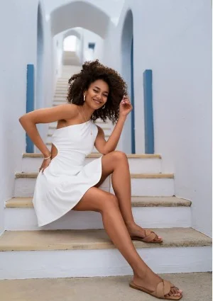 W fasonie Teyny najlepiej poczują się kobiety, które kochają słońce, opaleniznę i minimalizm. To mocno wycięta sukienka z odkrytymi plecami, która zapewnia komfortowy przewiew. Ma uniwersalny i ponadczasowy styl, więc skorzystasz z niej w niejednym sezonie. Została wykonana w czystej, klasycznej bieli dlatego przepięknie skomponuje się z kolorowymi, tak naprawdę dowolnymi akcesoriami. Mogą to być słomkowe dodatki, biżuteria etno, jak i akcesoria z kamieniami szlachetnymi w każdym, intensywnym kolorze. Za każdym razem zyskasz elegancką estetykę! Biała sukienka mini z falbanką i asymetrycznym dekoltem na jedno ramię posiada finezyjnie przeplecione wiązanie na plecach. Model jest dostępny także w czarnym kolorze.