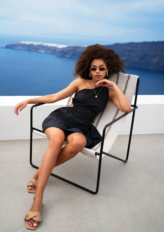 Czarna sukienka letnia mini w stylu boho ze zmysłową, jednocześnie komfortową ekspozycją pleców. Idealna na upalne dni i wakacje.