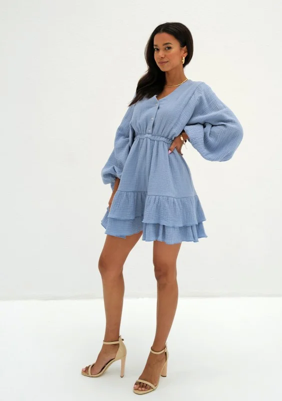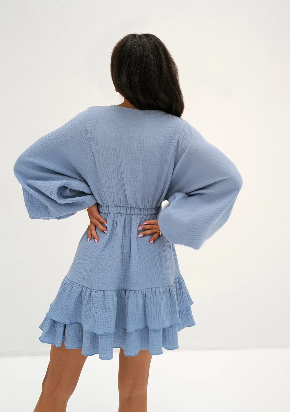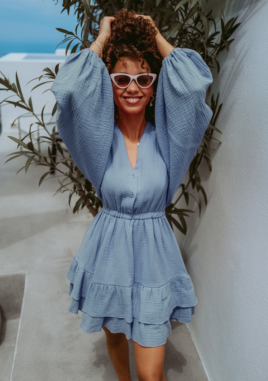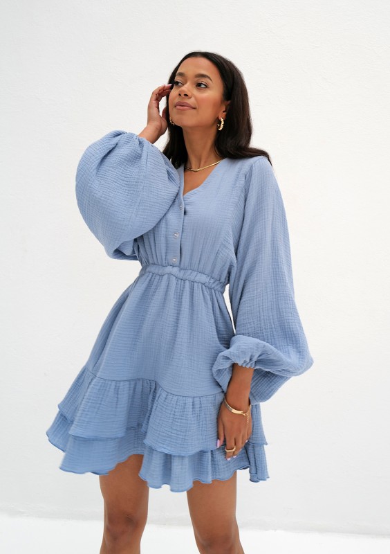 Niebieska sukienka mini z falbankami i długim rękawem. Uszyta z naturalnej, komfortowo cienkiej tkaniny o fakturze muślinu.