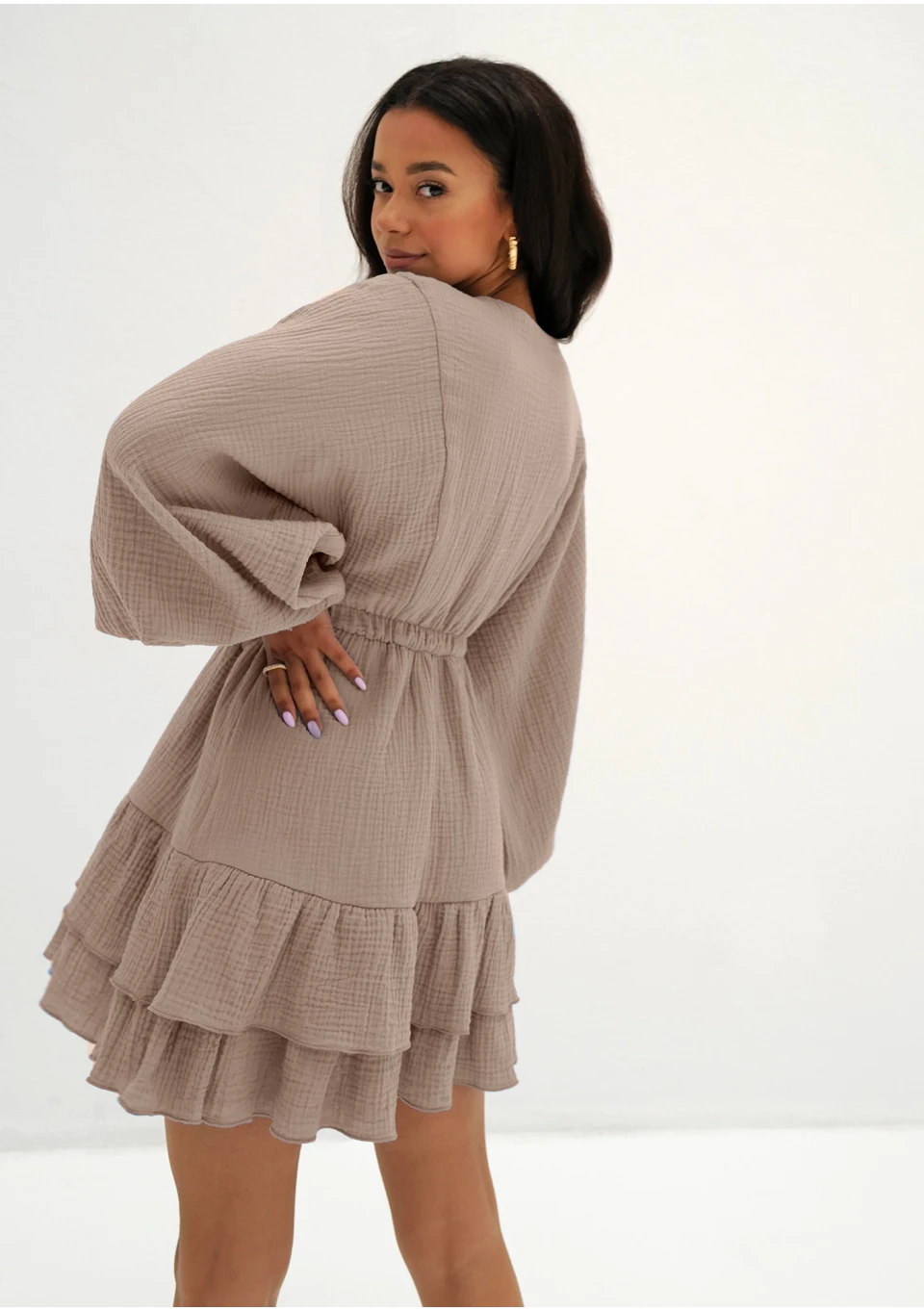 Beżowa sukienka mini z falbankami i długim rękawem. Uszyta z naturalnej, komfortowo cienkiej tkaniny o fakturze muślinu. Idealna na letnie wyjazdy, jak i na co dzień, do pracy.