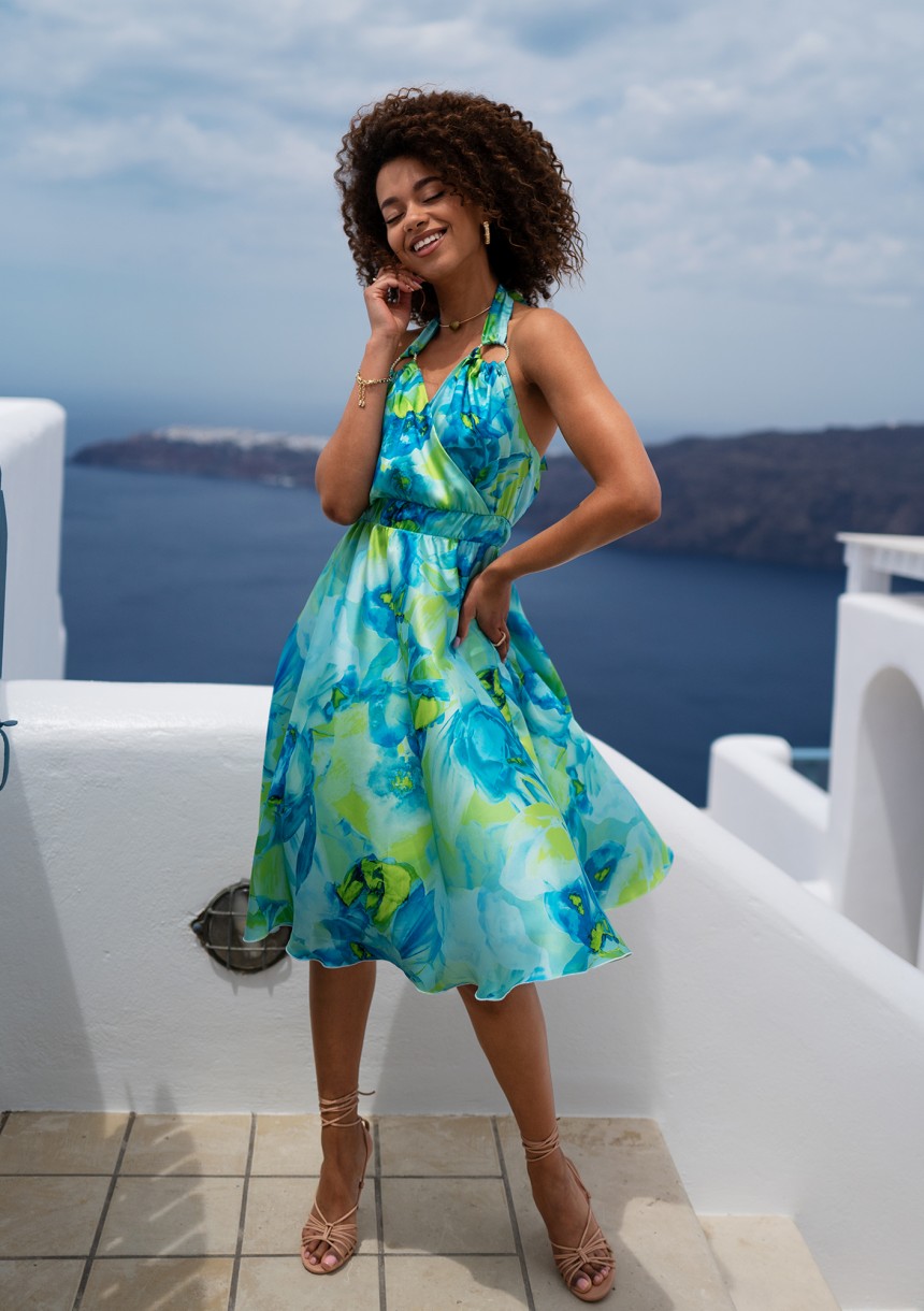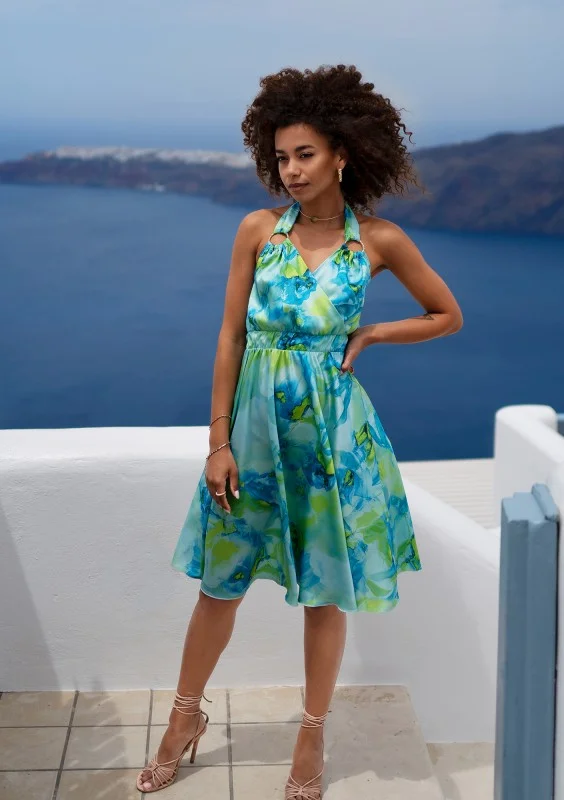 Koktajlowa sukienka midi na lato z kopertowym dekoltem i wiązaniem na szyi. Rozkloszowany fason i wyjątkowa kolorystyka idealnie podkreślą Twoją kobiecość.