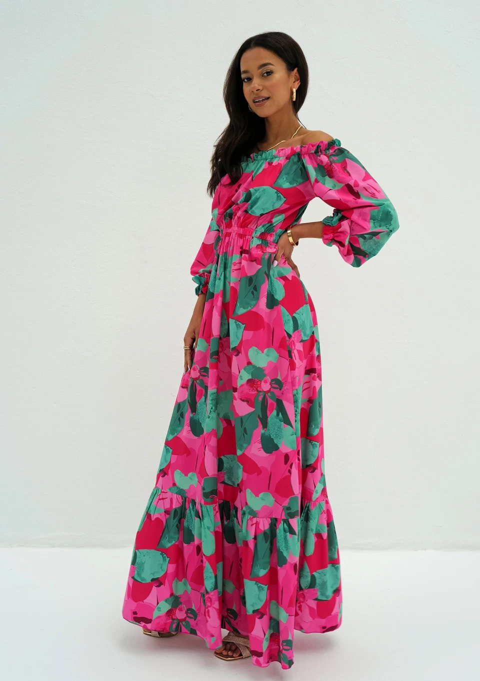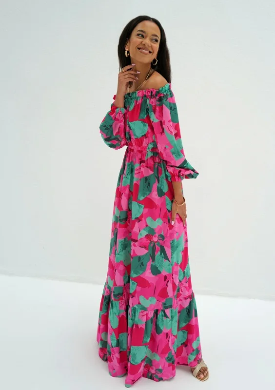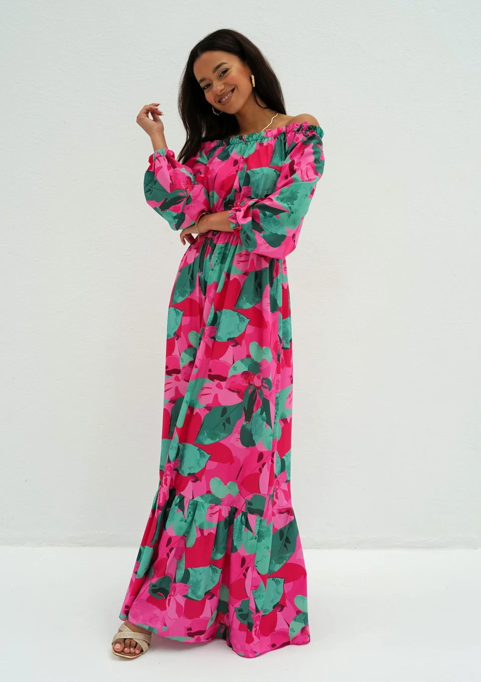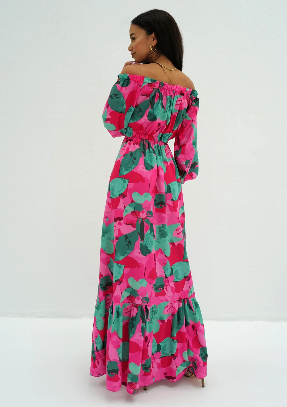 Wzorzysta sukienka z falbaną i dekoltem zmysłowo eksponującym ramiona. Piękny print, zwiewny fason i długość maxi w sam raz na wyjątkowe okazje i wakacje.