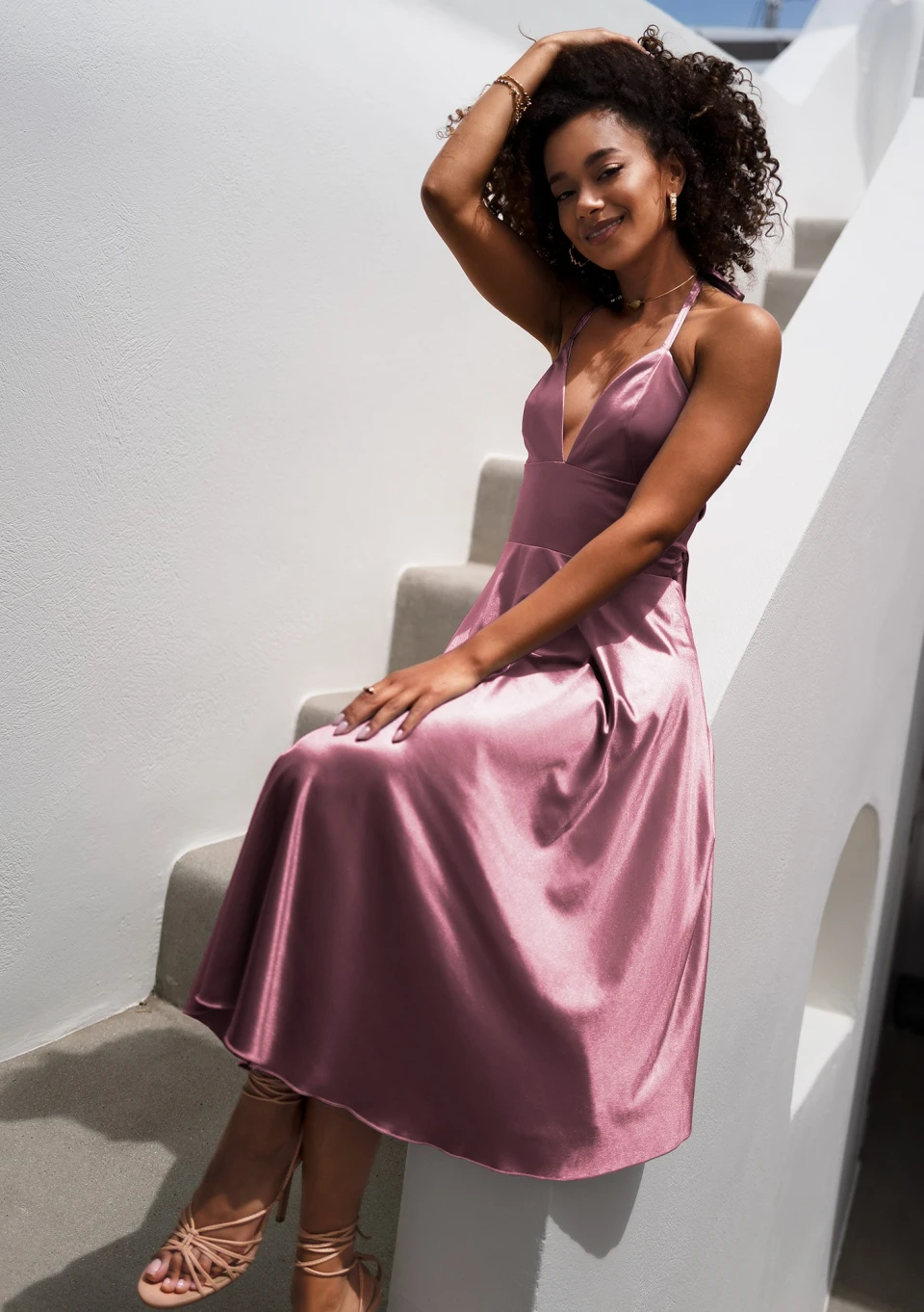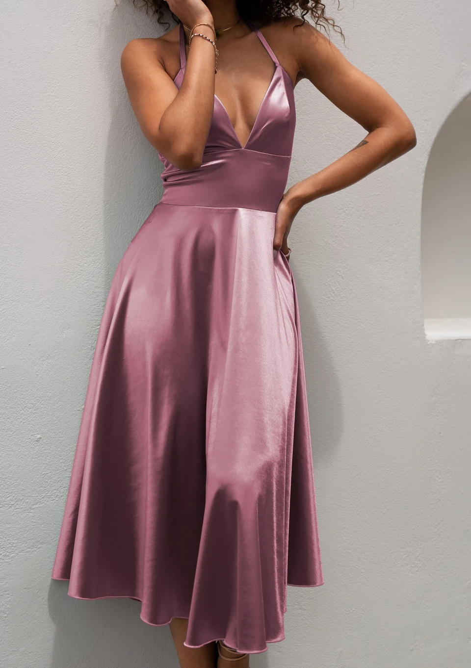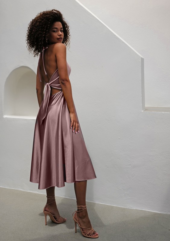 Elegancka sukienka midi w pudrowym różu z olśniewająco błyszczącej satyny. Rozkloszowany fason z ponętnym dekoltem i odkrytymi plecami.