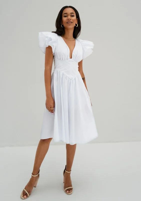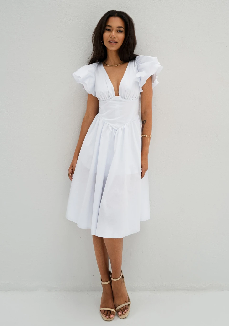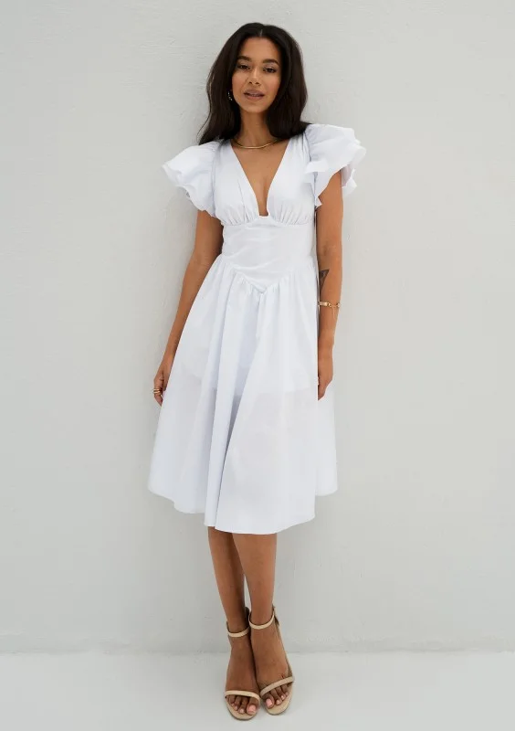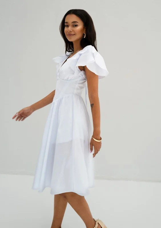 Biała sukienka midi o przepięknym fasonie z falbanami na rękawkach i gorsetową wstawką. Uszyta w polskiej szwalni ze zwiewnej bawełny.