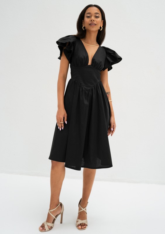 Czarna sukienka midi o przepięknym fasonie z falbanami na rękawkach i gorsetową wstawką. Uszyta w polskiej szwalni ze zwiewnej bawełny.