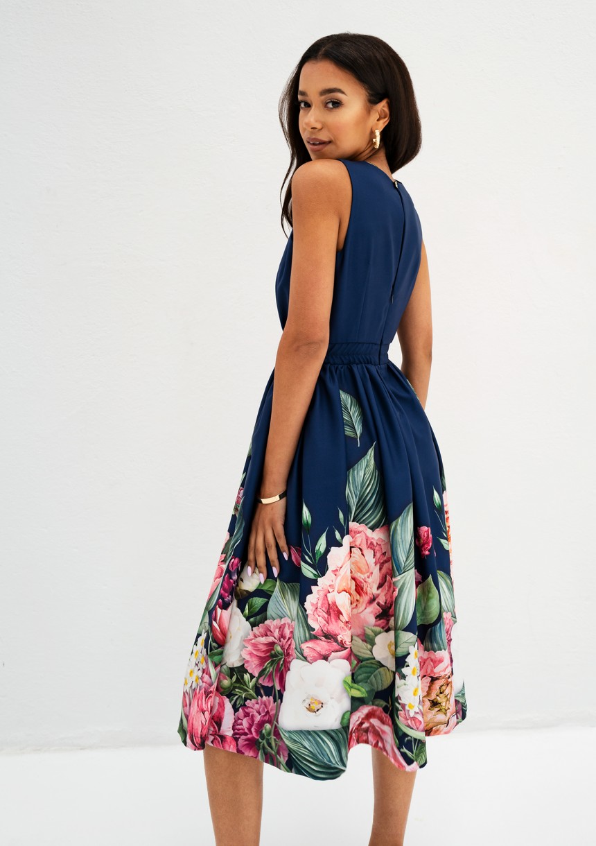 Rozalia - Sukienka midi z kwiatowym borderem Granatowa