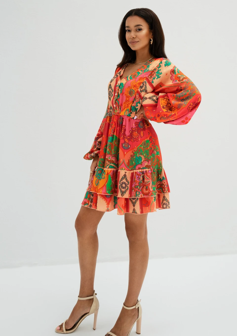 Fason mini, rozkloszowany z falbankami, z długimi rękawami i gumką w talii. Dekolt w serek z guziczkami.