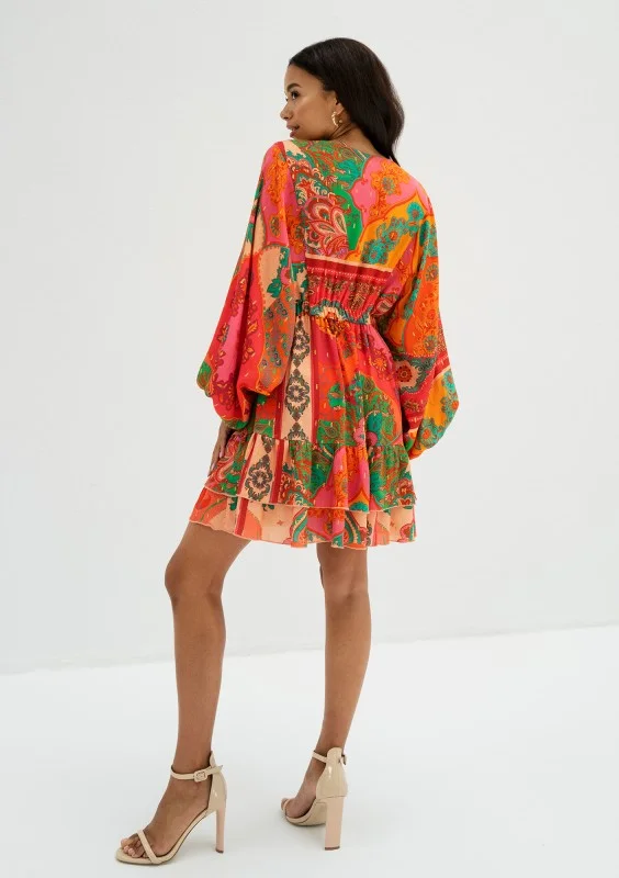 Cudowna sukienka mini na lato z kolorowym wzorem boho, subtelnie dekorowana falbankami. Przepiękna kreacja o niepowtarzalnym stylu, uszyta z komfortowej wiskozy.