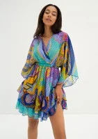 Senaya to mocno wyróżniająca się sukienka z szyfonu. Sekret niepowtarzalności to kontrastujące kolory wzoru. Piękny, zwiewny szyfon doskonale współgra z krojem boho, szerokimi rękawkami i falbankami. Dopracowany design podkreśla również nakrapiana faktura materiału. Letnia sukienka mini pięknie akcentuje atuty sylwetki, posiada kopertowy dekolt i elastyczną gumkę zarysowującą talię. Kreacja w prawdziwie wakacyjnym wydaniu, idealna na przeróżne, oficjalne, jak i proste okazje. Sprawdzi się jako sukienka na randkę lub imprezę.