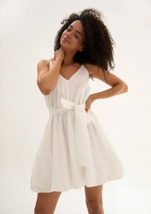 Fason mini, rozkloszowany, z gumką w talii, kopertowym dekoltem i falbankami.