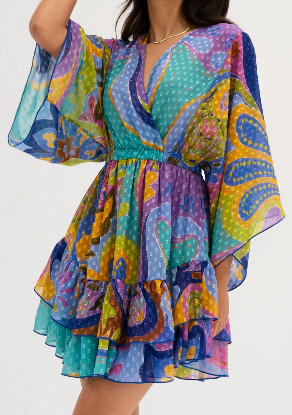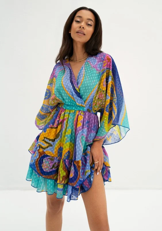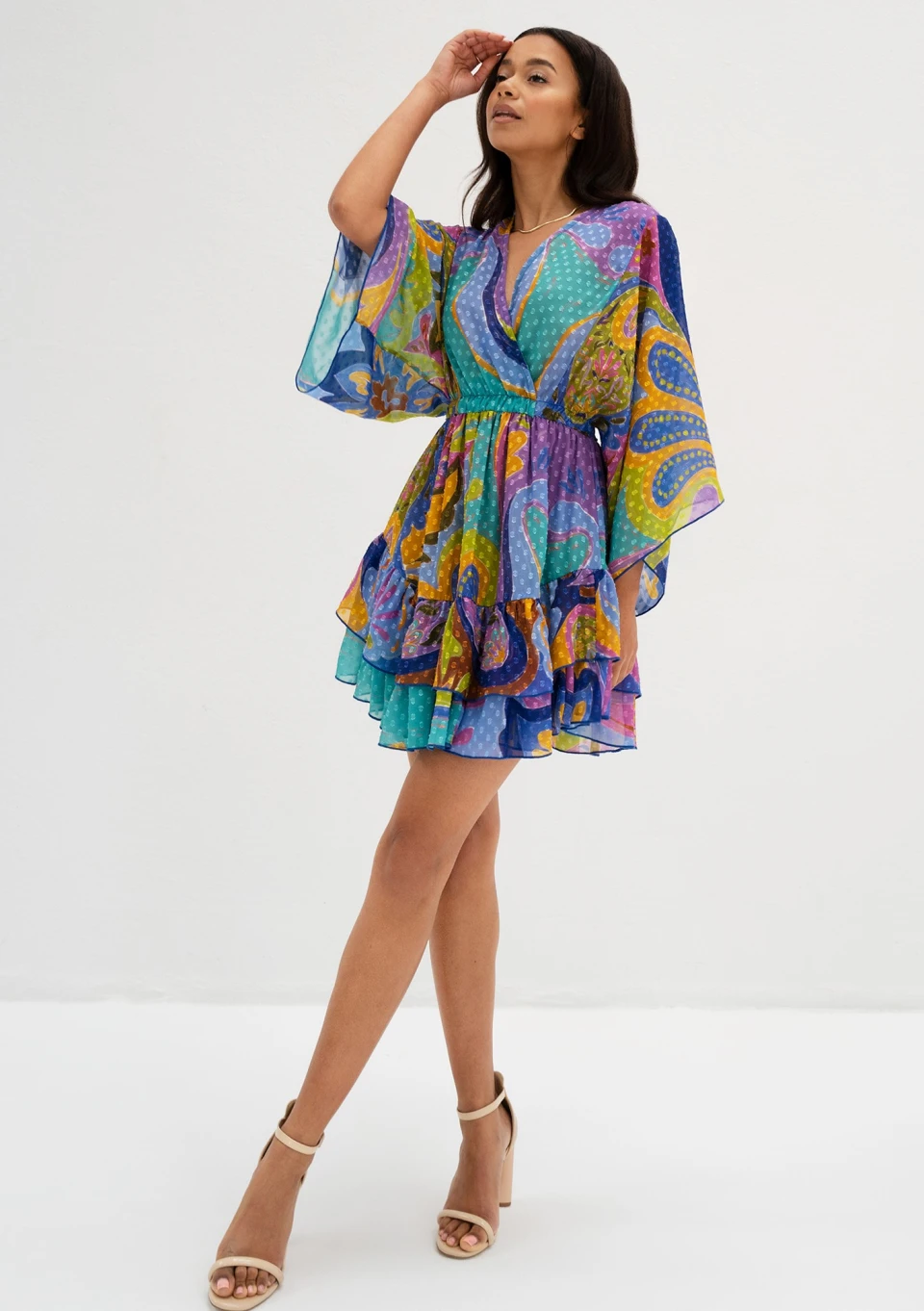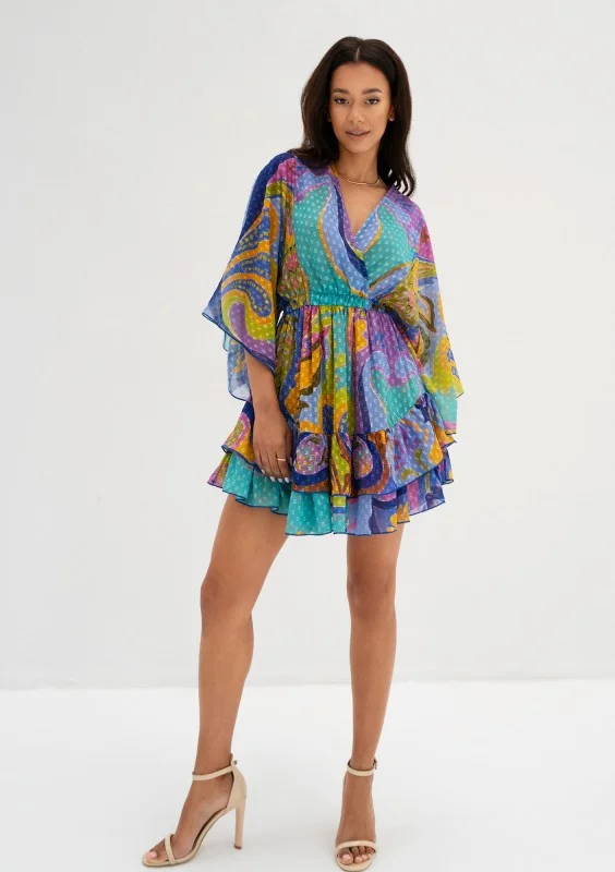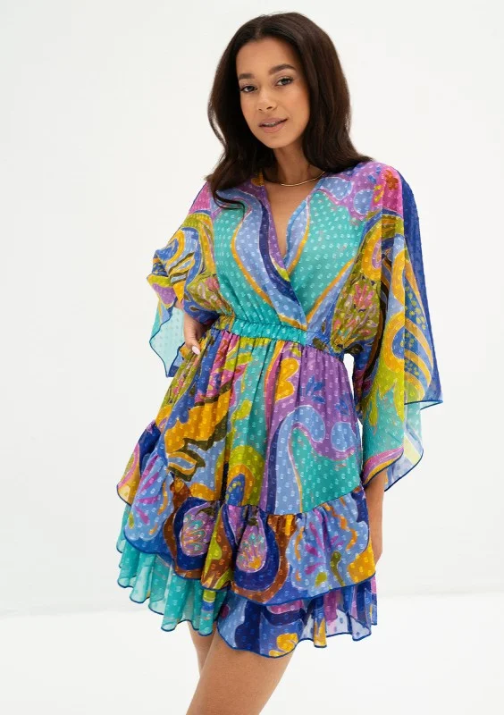 Zwiewna sukienka mini z szyfonu w kolorowym wzorze boho. Dopełniona urokliwymi falbankami i kropeczkami na materiale.
