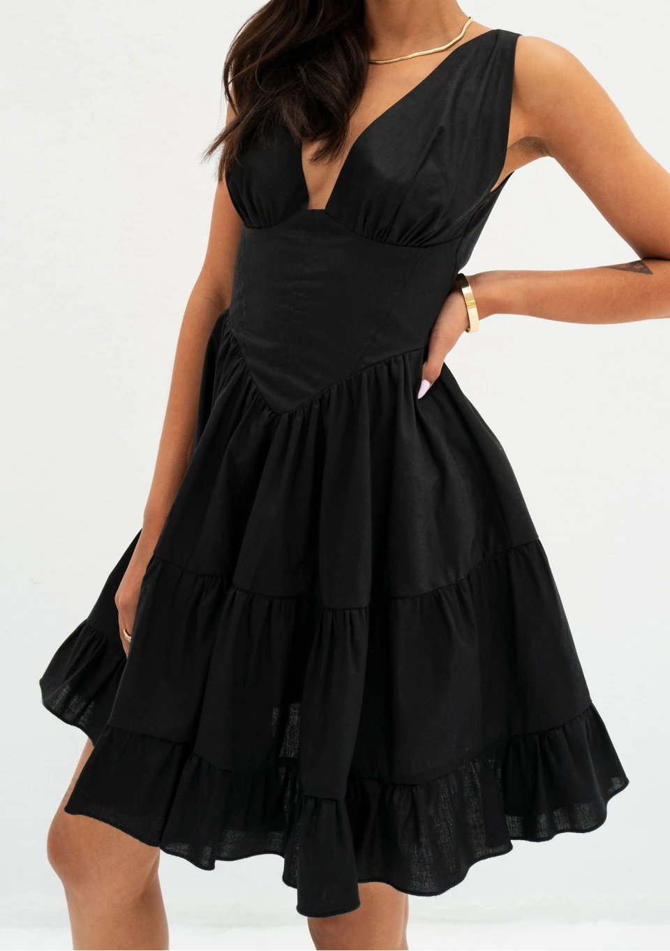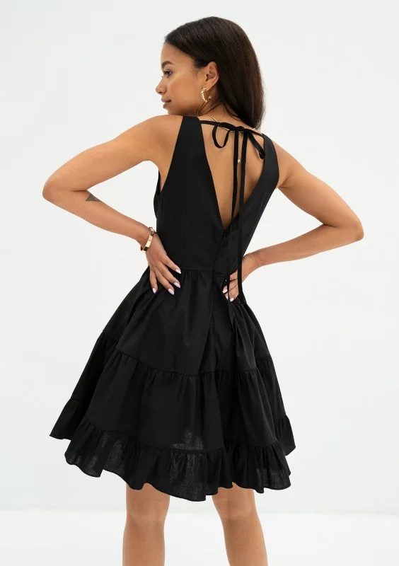 Czarna sukienka letnia z bawełny. Pełna uroku, rozkloszowana kreacja z przeszyciami i oryginalnym dekoltem z gorsetową wstawką.