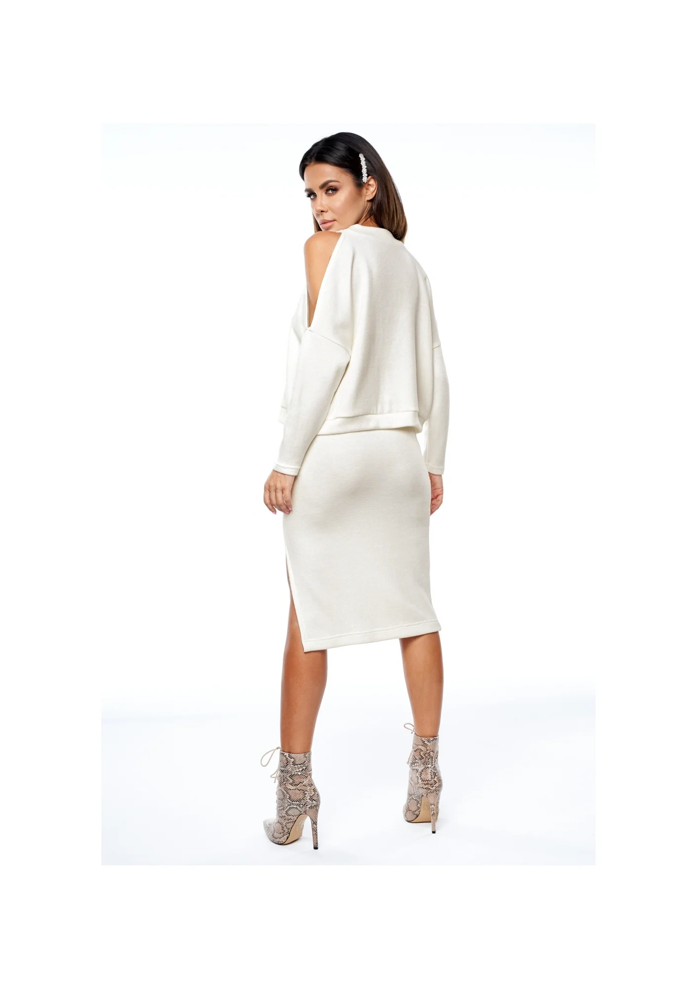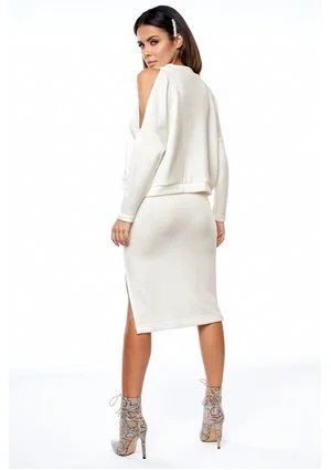 Codziennie elegancka? To się nazywa mieć klasę! Piękna Natalia Siwiec udowadnia, że na co dzień można wyglądać stylowo, zachowując maksimum wygody. Zachwycający komplet z dzianiny swetrowej tworzy spódnica wraz z niebanalną bluzką. Spódnica z wysokim stanem i wszytą, szeroką gumą rewelacyjnie podkreśla krągłości, a rozcięcie z boku ponętnie eksponuje zgrabne nogi. Góra to luźniejsza bluzka z długim rękawem i z fantazyjnymi wycięciami na ramionach. Całość jest utrzymana w delikatnym odcieniu ecru i pięknie łączy się z dodatkami w żywych kolorach. Chcąc przełamać jasną tonację, ale zachować elegancję, warto uzupełnić stylizację czarnymi butami i dopasowaną do nich torebką. Łagodny charakter kompletu można kontrastowo zestawić z wyrazistym obuwiem, np. zabudowanymi botkami na obcasie lub płaskiej podeszwie czy butami sportowymi. Lekkiego, casualowego tonu nadadzą sneakersy i trampki. Najlepiej pasującymi torebkami będą te większe, na szerszym pasku lub do noszenia w dłoni. Sprawdź również nasze pozostałe swetry damskie.