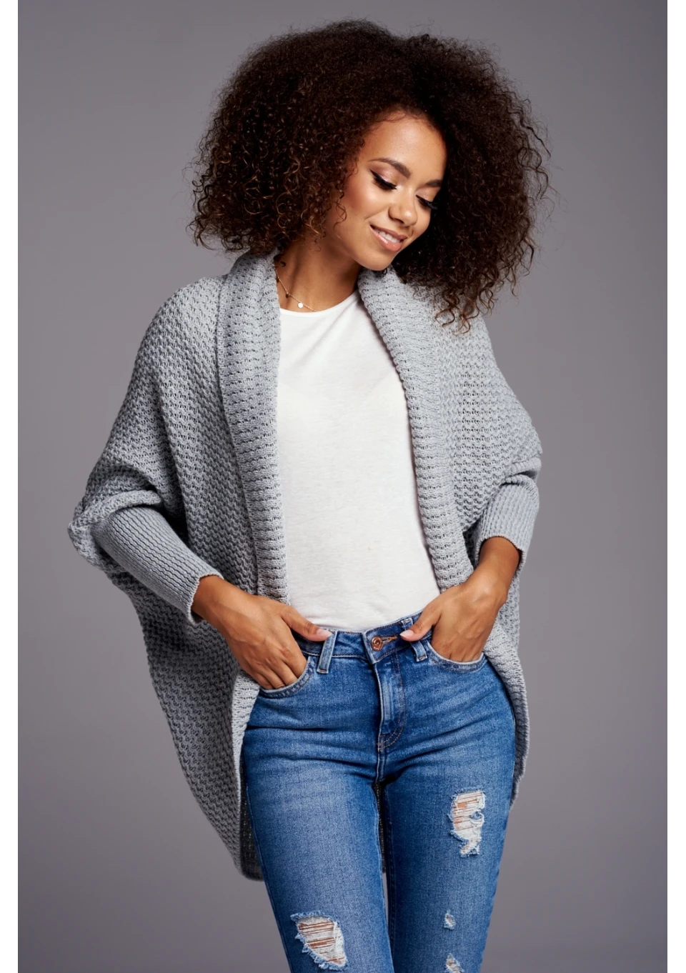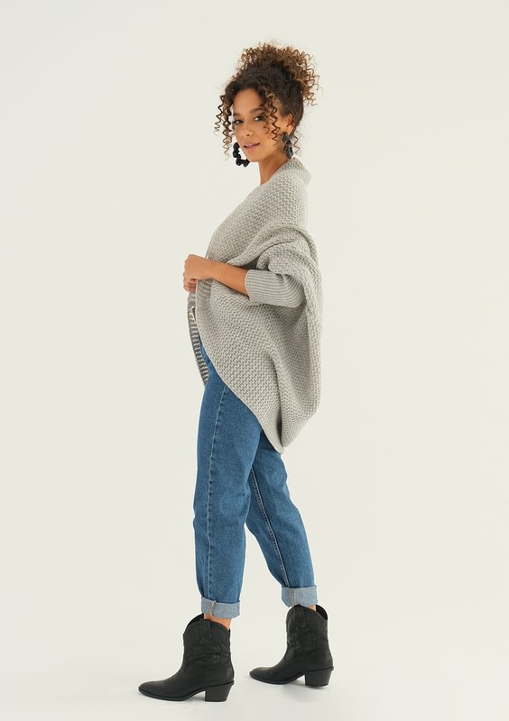 Lekka narzutka o owalnym kroju, bardzo luźna i swobodna. Jej owalny kształt sprawia, iż stylizacja nabiera bardzo eleganckiego stylu. Wykonana w szarym kolorze, okaże wszechstronne zastosowanie.