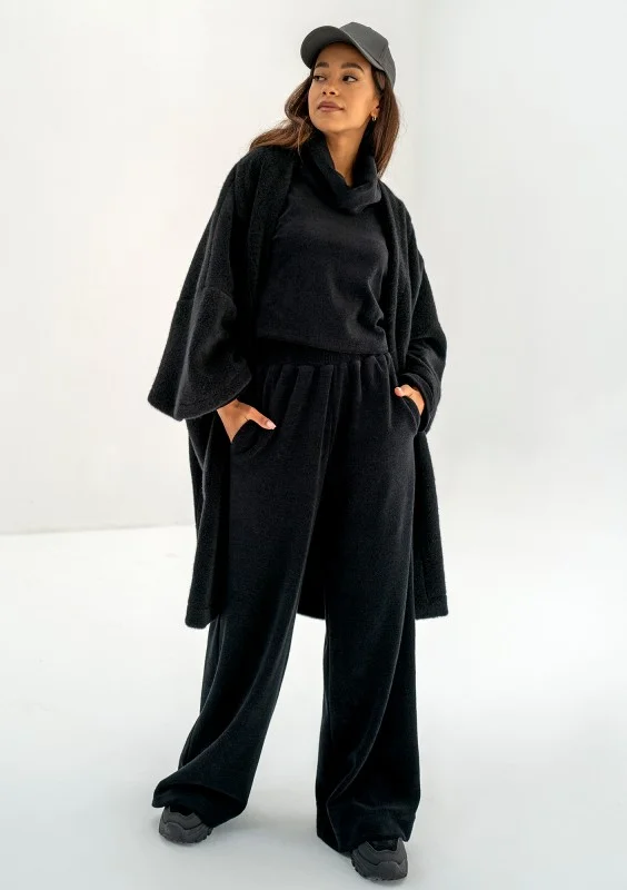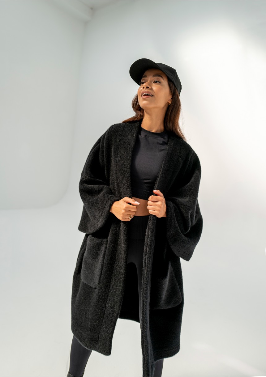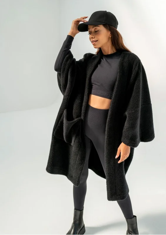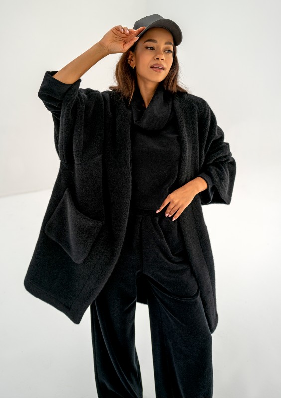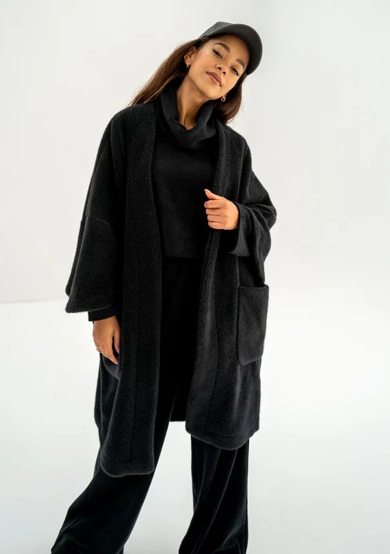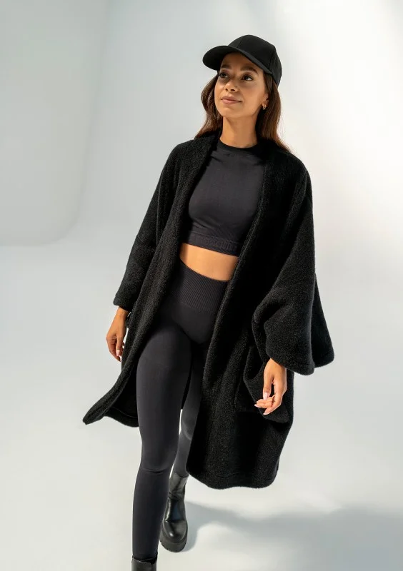 Oversizowy kardigan damski w czarnym kolorze to przebój naszej jesienno - zimowej kolekcji. Już na sam jego widok robi się przyjemnie ciepło :) Wykonany został z miękkiej dzianiny, która imituje wełnę alpaki. Prosty design zapewnia możliwość swobodnego komponowania stylizacji. Bunch jest idealny do tego, by szybko narzucić go na ramiona, zabrać ciepłą kawę w dłoń i wyruszyć na codzienne zajęcia, spotkania, do pracy czy na spacer.