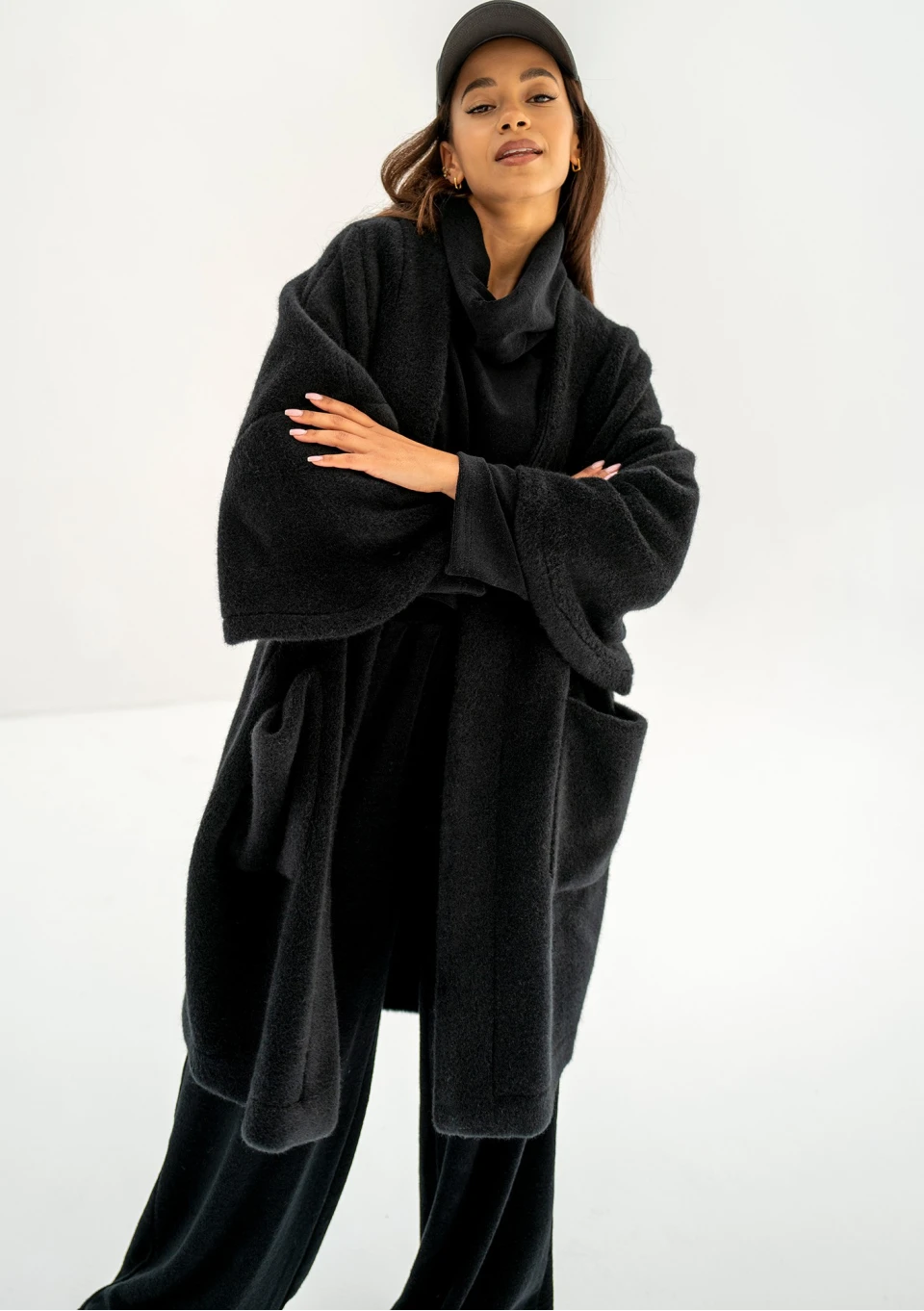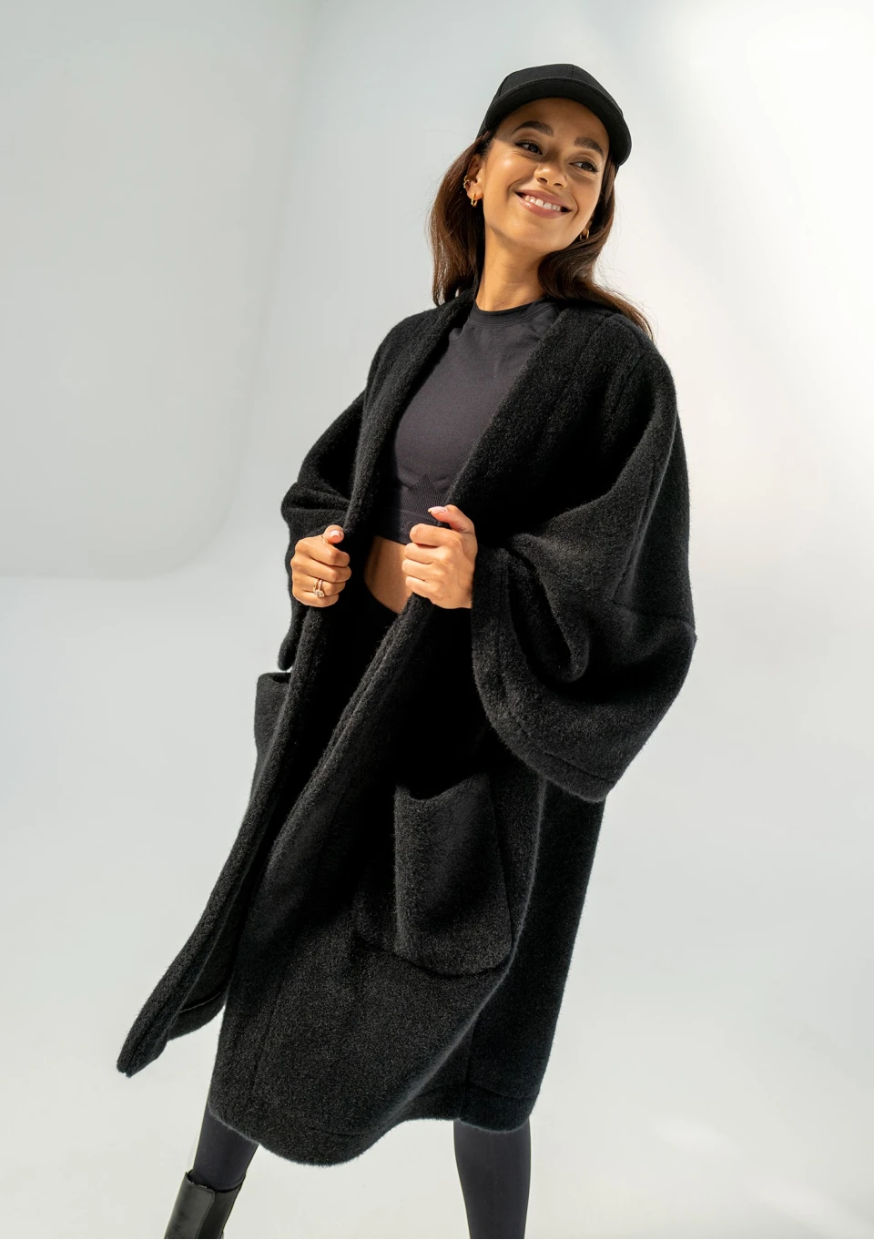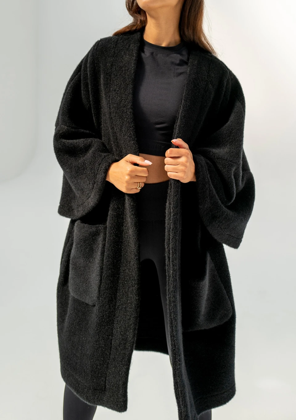 Oversizowy kardigan damski w czarnym kolorze to przebój naszej jesienno - zimowej kolekcji. Już na sam jego widok robi się przyjemnie ciepło :) Wykonany został z miękkiej dzianiny, która imituje wełnę alpaki. Prosty design zapewnia możliwość swobodnego komponowania stylizacji. Bunch jest idealny do tego, by szybko narzucić go na ramiona, zabrać ciepłą kawę w dłoń i wyruszyć na codzienne zajęcia, spotkania, do pracy czy na spacer.