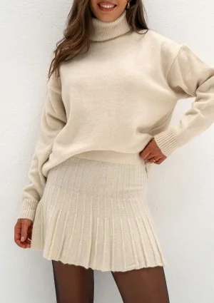 Beżowy sweter damski z golfem to inwestycja, która pozwoli Ci stworzyć wiele różnorodnych stylizacji. Jego uniwersalność sprawia, że będzie Ci towarzyszył przez wiele sezonów. Stwórz komplet na jesienno - zimowy sezon, łącząc go ze spódniczką Jesse.